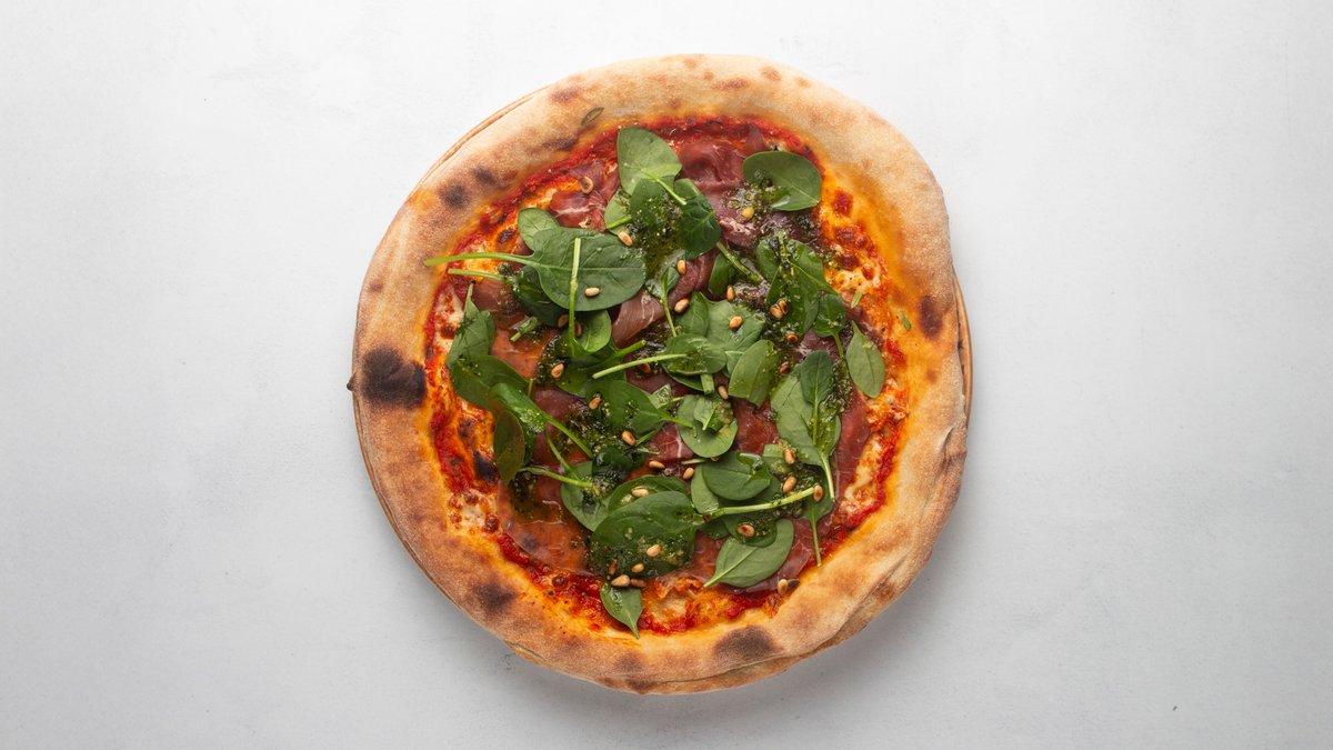Tomatsås, mozzarella, lufttorkat oxkött, vitlöksolja, pesto, pinjenötter och babyspenat.