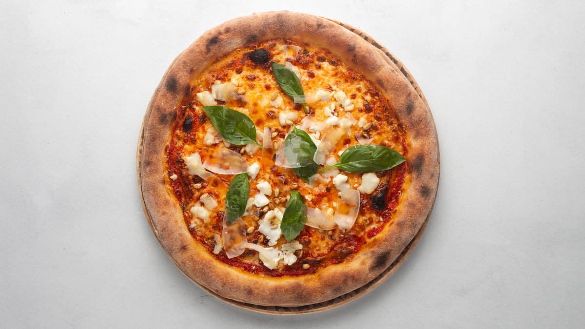 Tomatsås, mozzarella, gorgonzola, chevré, parmesan, basilika, olivolja och rostade pinjenötter.