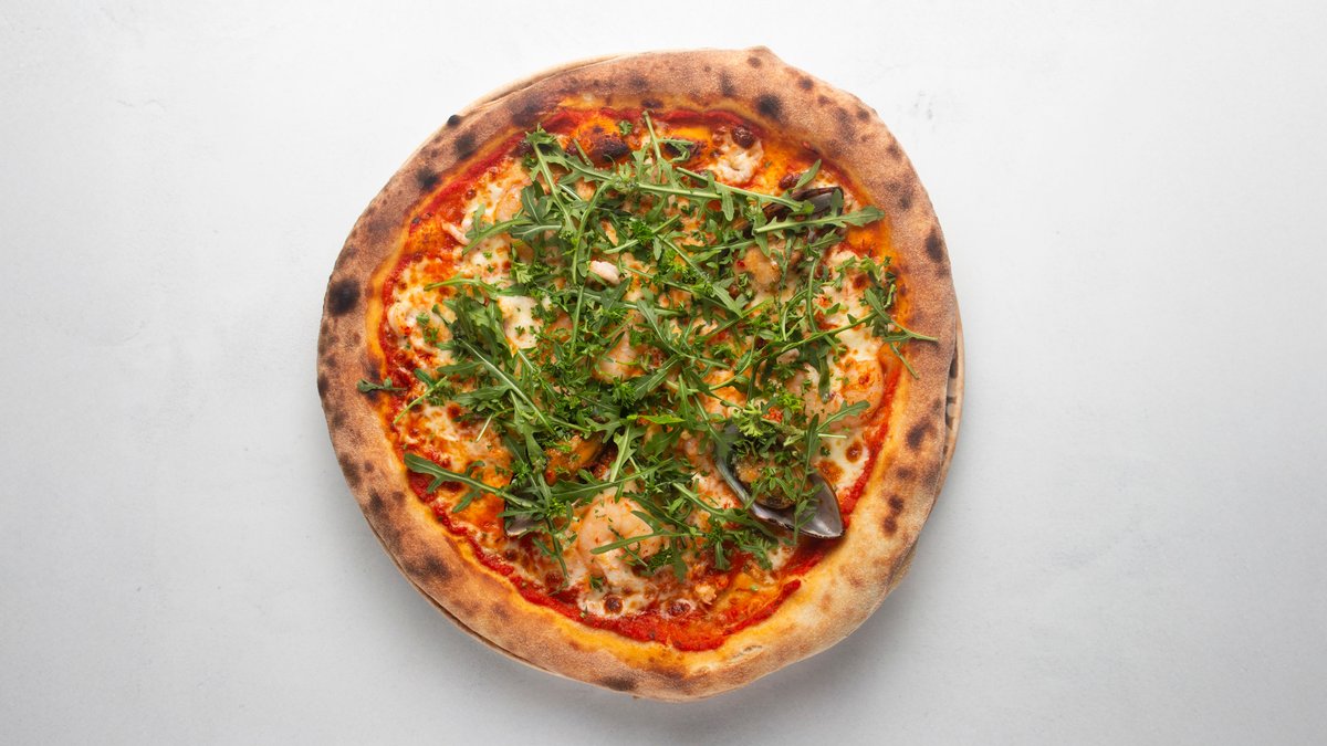 Tomatsås, mozzarella, scampi, grönmusslor, handskalade räkor, kräftstjärtar, vitlöksolja, persilja och ruccola.
