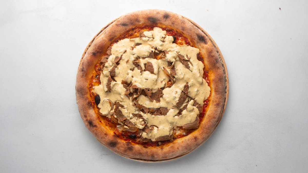 Tomatsås, mozzarella, kebabkött (nöt), lök och kebabsås.