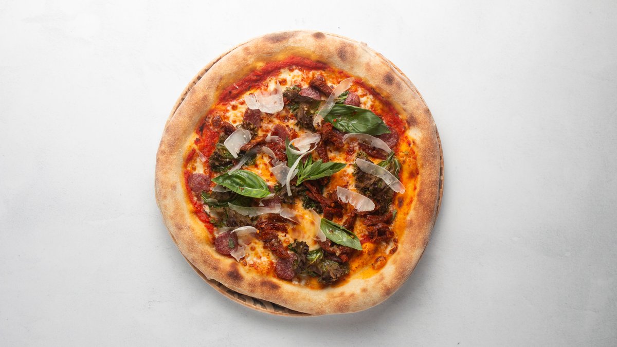 Tomatsås, mozzarella, salsiccia, grönkål, vitlök, soltorkade tomater, basilika, chiliflakes och parmesan.