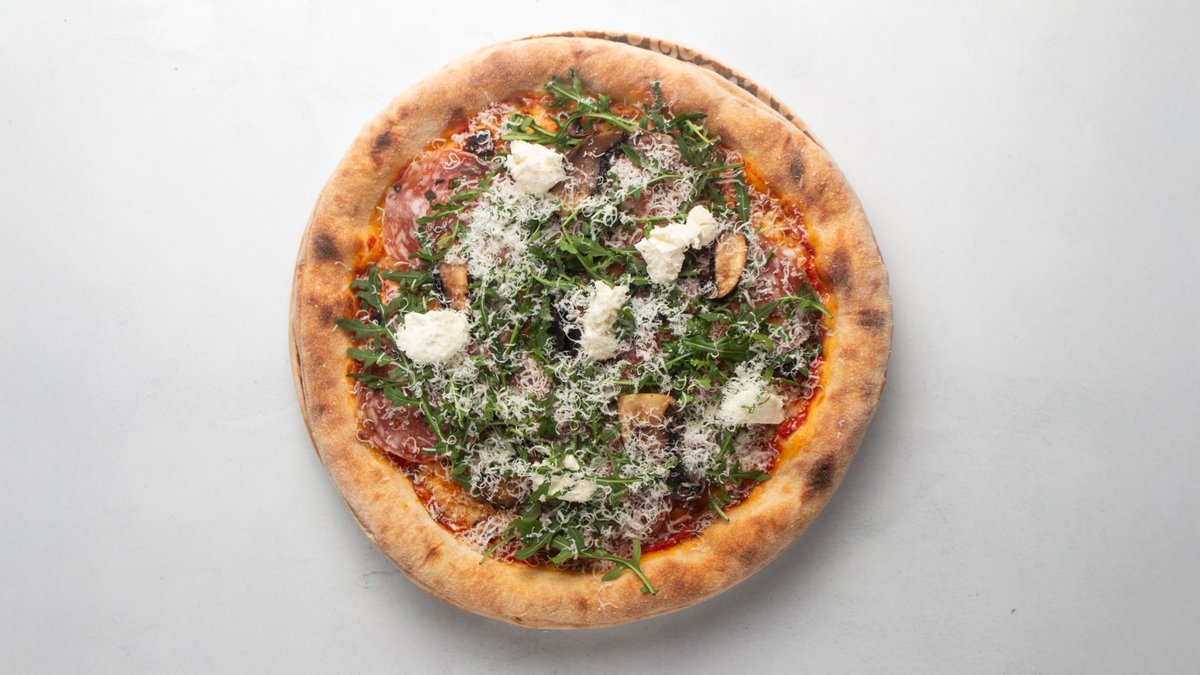 Tomatsås, mozzarella, tryffelsalami, portabello, mascarpone, tryffelolja, ruccola och parmesan.