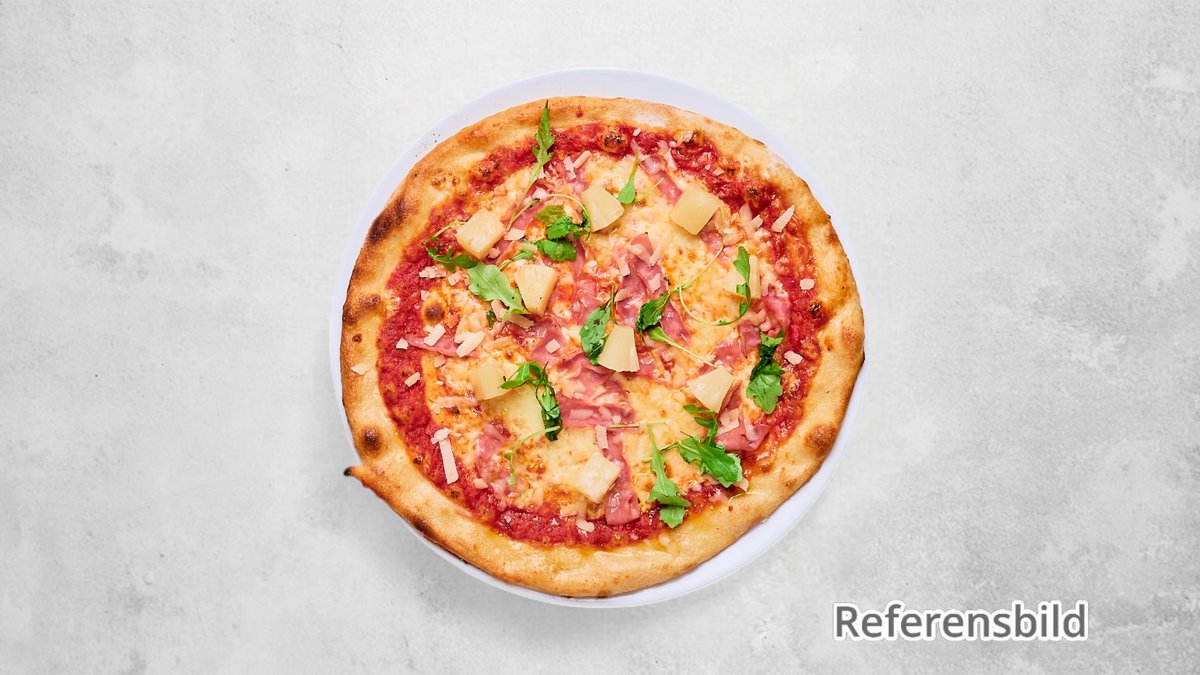Ost, skinka, ananas, isbergssallad, tomat, gurka, ananas, ruccola och dressing.