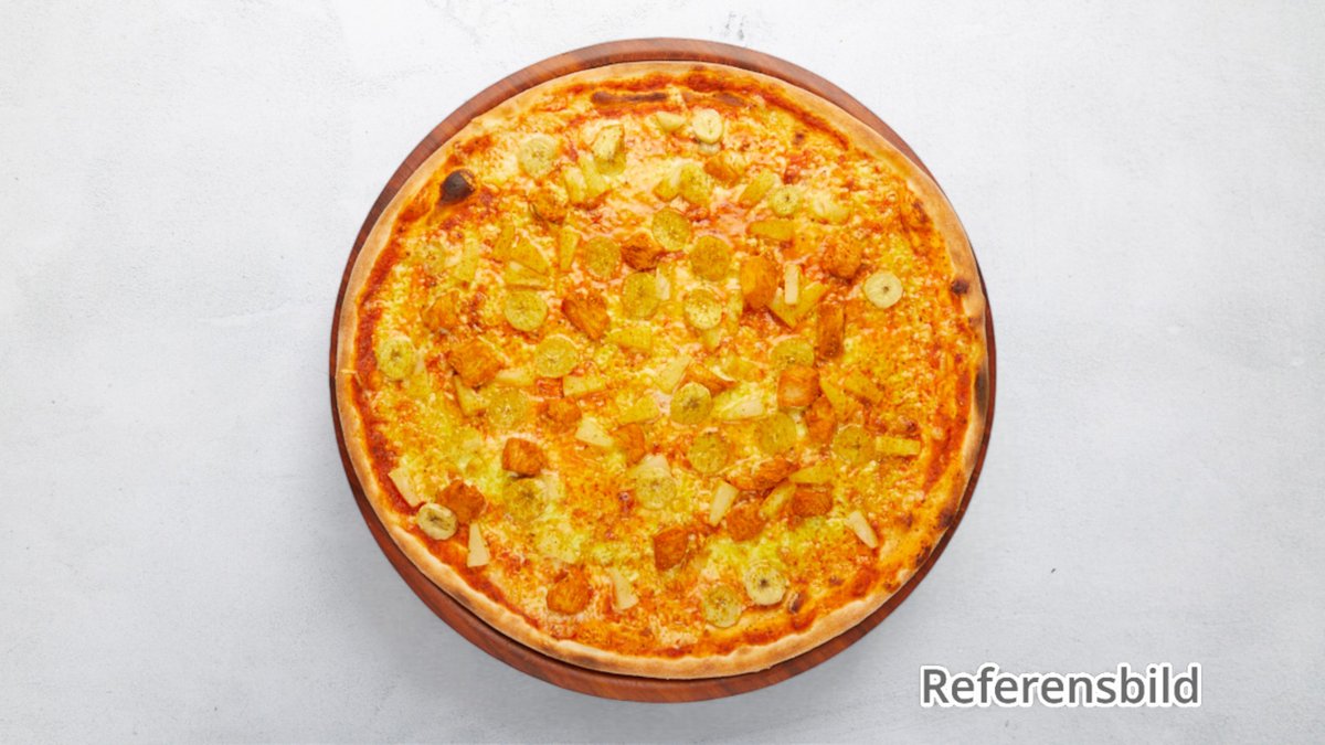 Ost vegan, skinka vegan, ananas, banan och currykrydda.