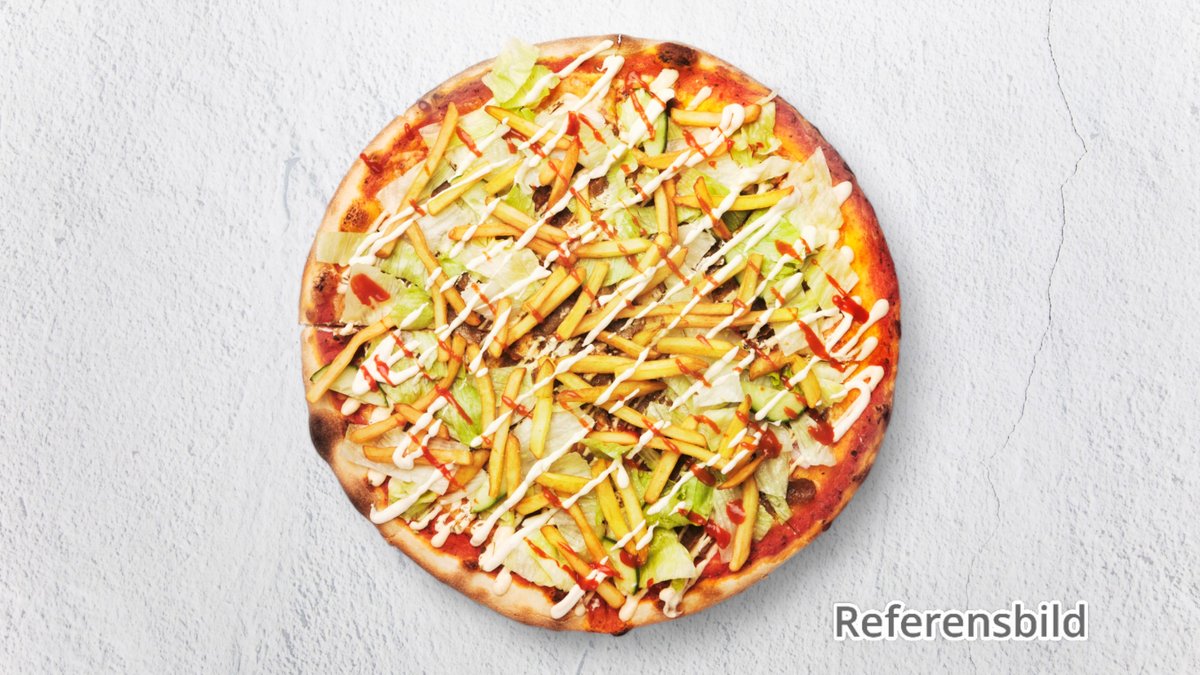 Kebab, feferoni, rödlök, isbergssallad, tomat, gurka, ananas, ruccola och dressing.