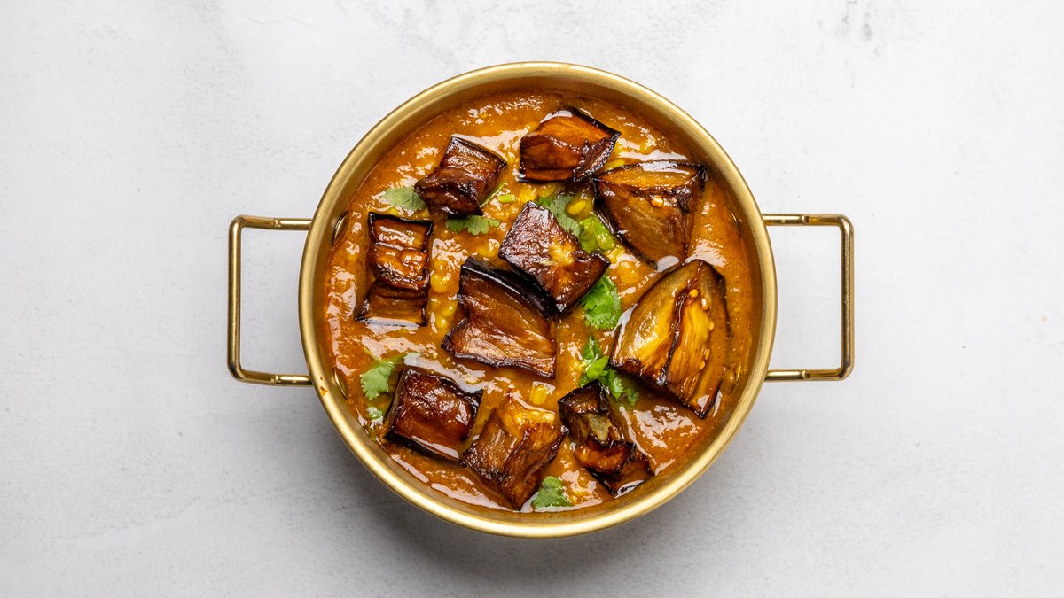 Aubergine med linser, lök, paprika, ingefära och koriander i en krämig tomatsås.