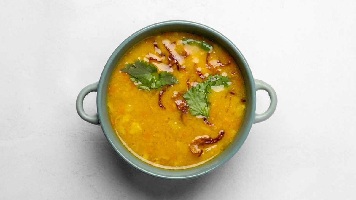 Soppa med blandade linser. Kryddad med vitlök, koriander och ingefära.