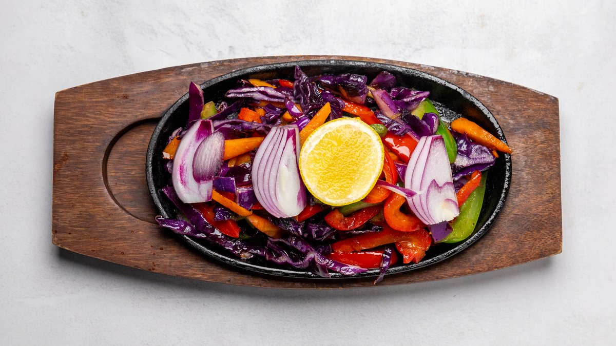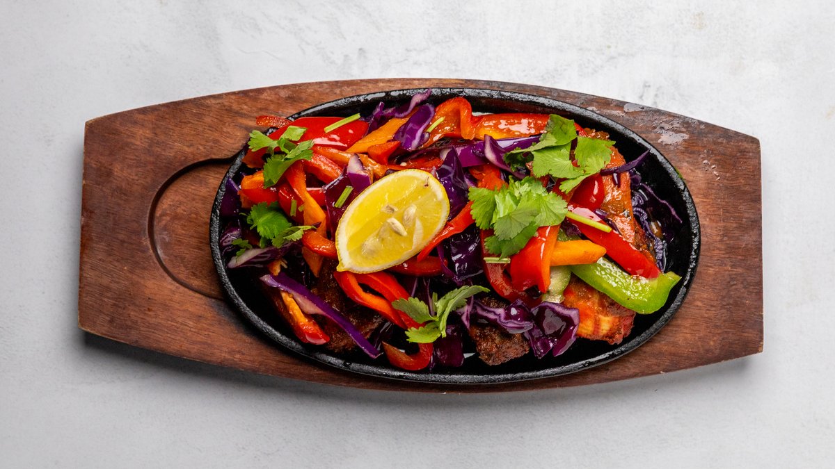 Vitlöksmarinerad kycklingfilé med en speciell sizzlersallad med vitlök. Serveras med en speciell sizzlar sås.