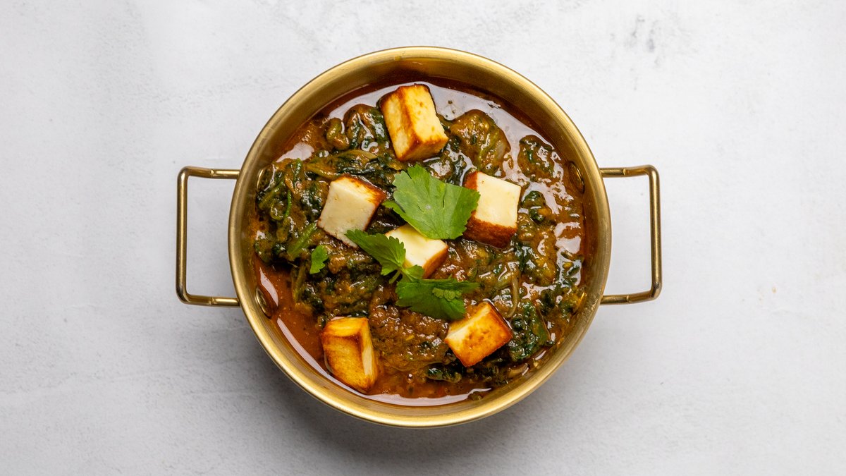 Serveras med palak paneer, begun karai och aloo gobi kashmiri. Små portioner.