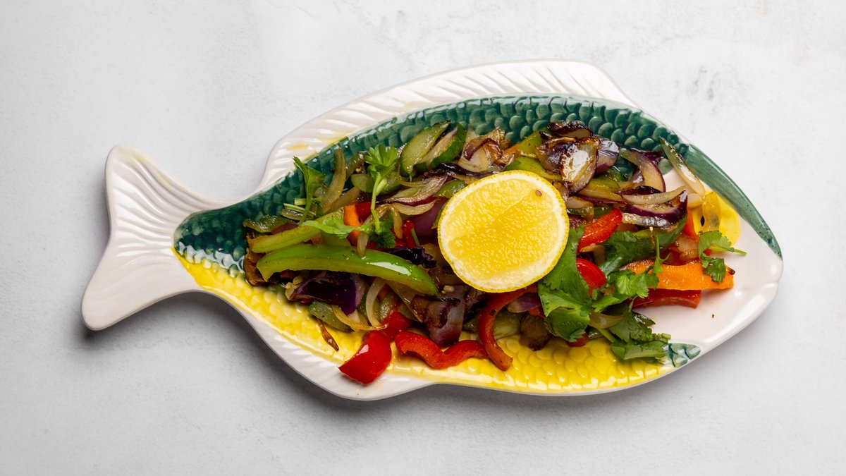 Grillad lax tillagas med blandade grönsaker och bengalisk kryddblandning.