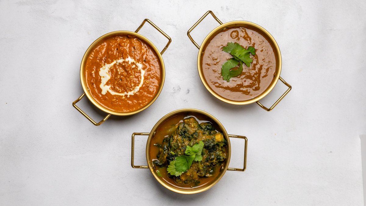 Serveras med kyckling tikka butter masala, bhuna lamm och räkor med spenat. Små portioner.