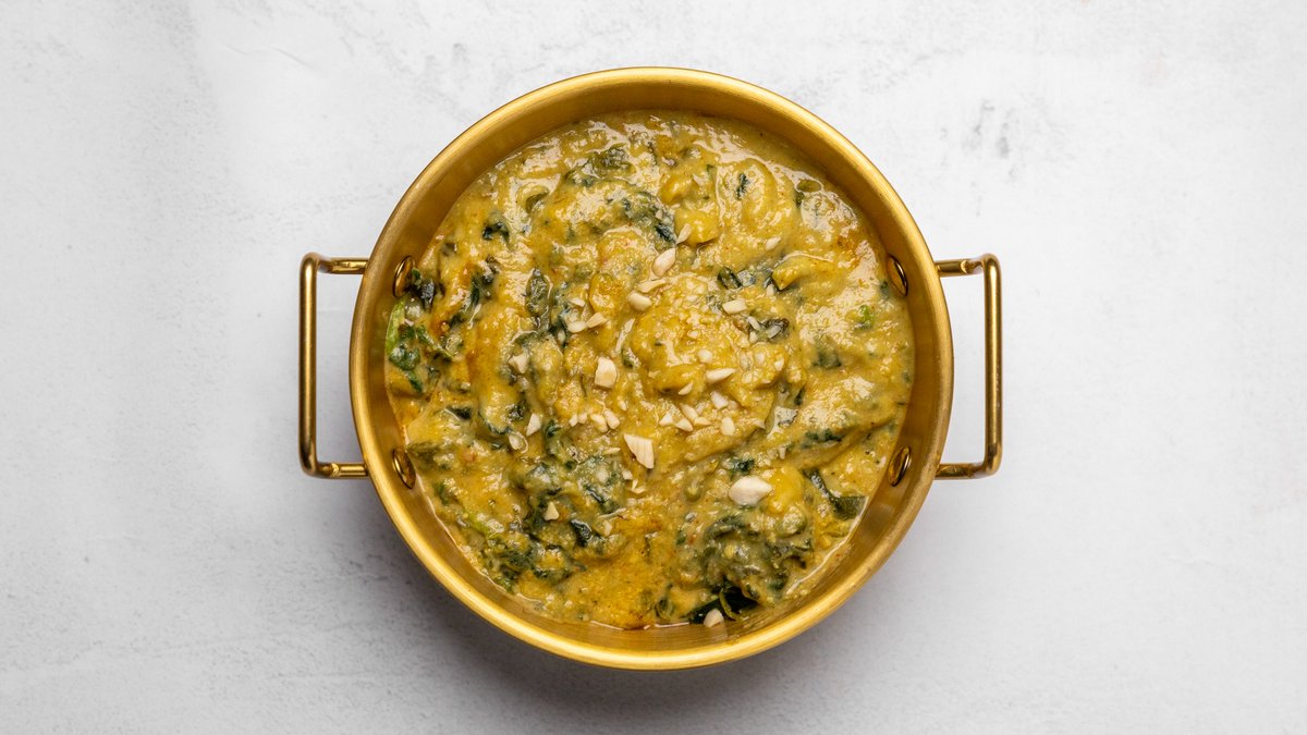 Små linser och spenat tillagade med ingefära och bengalisk kryddblandning.