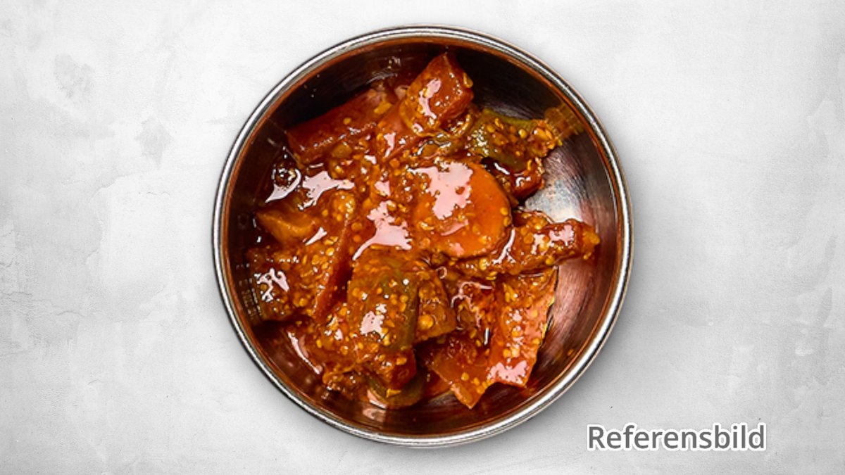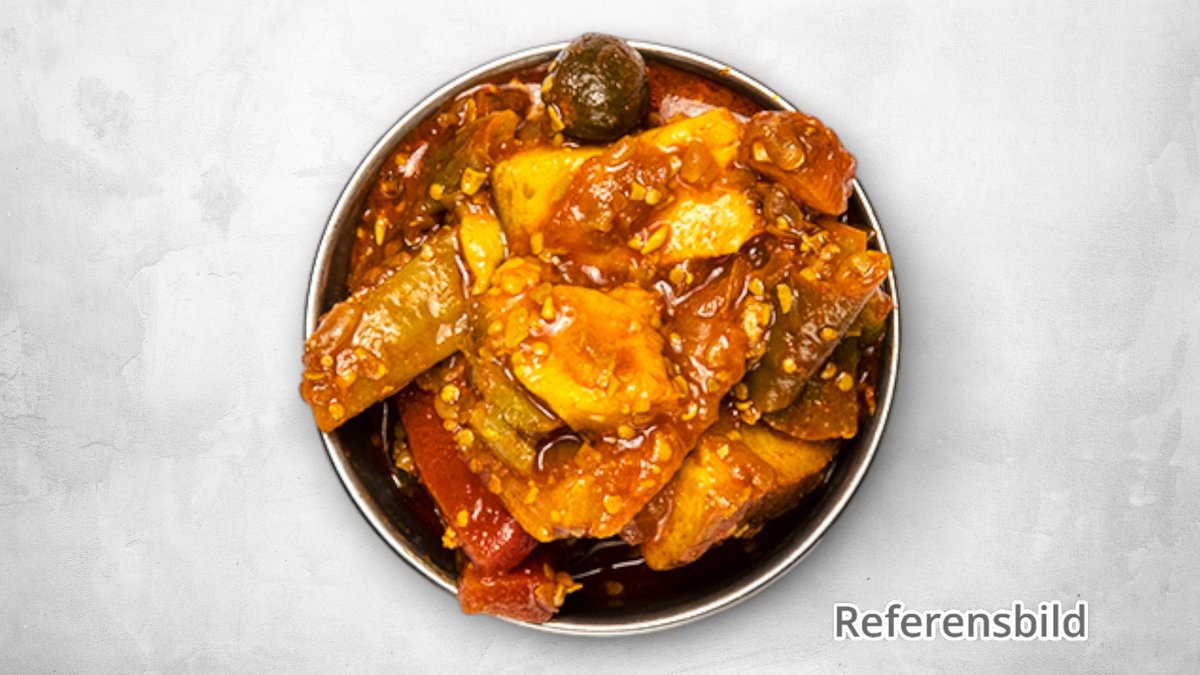 Tillagas med indiska pickles, tomat, lök och currysås.