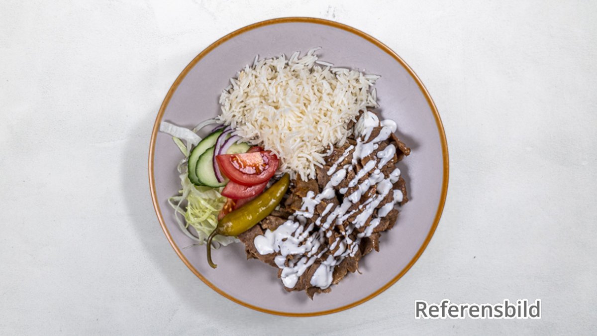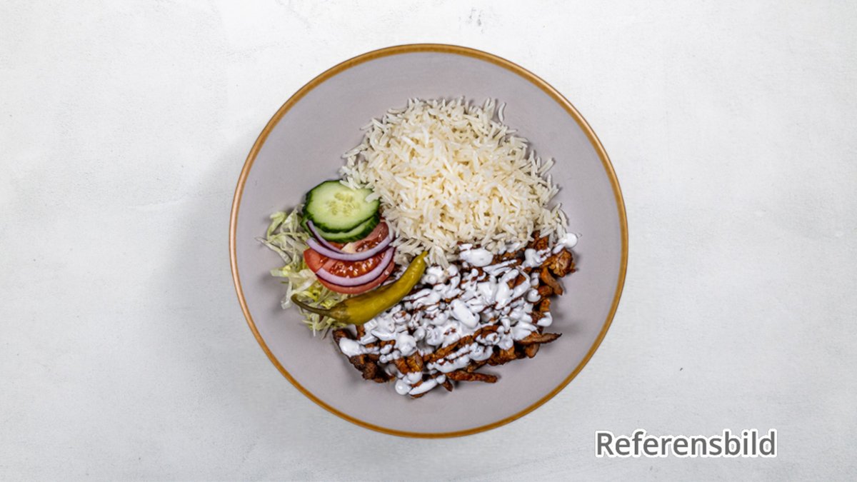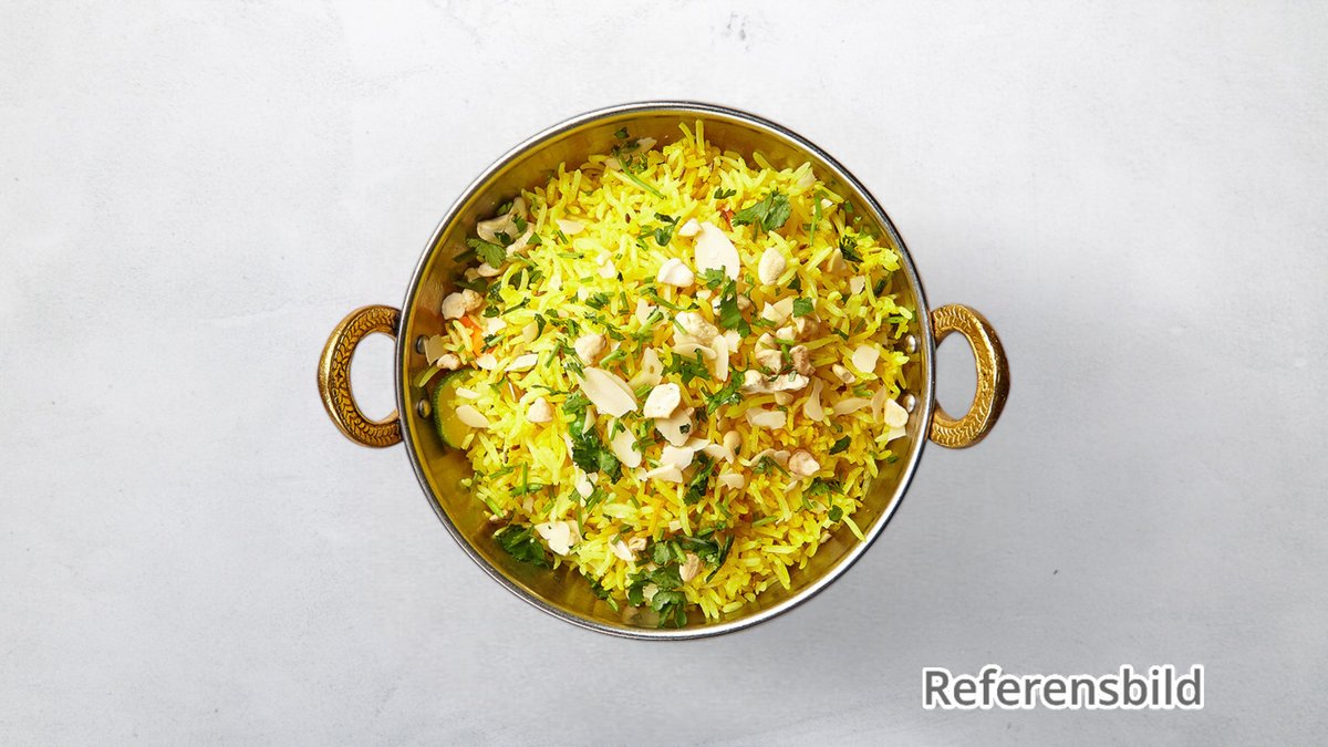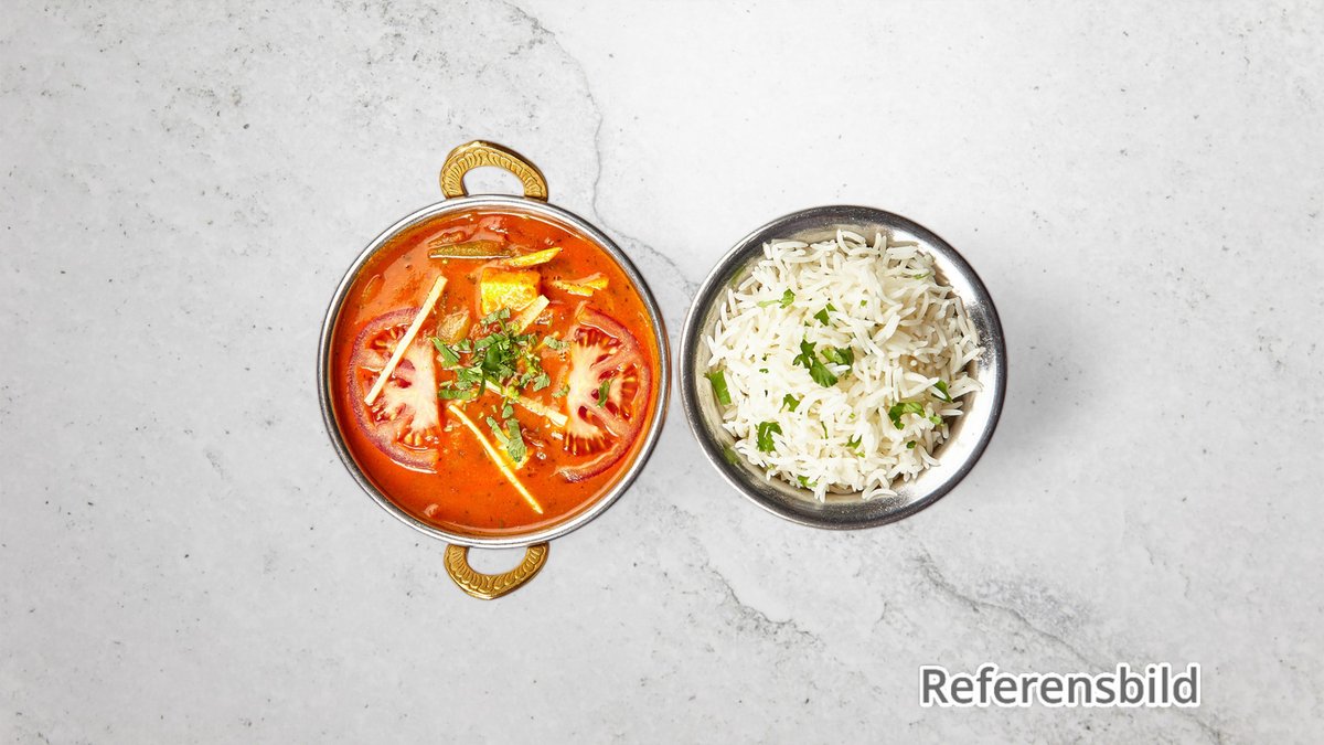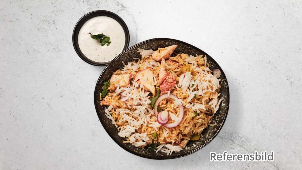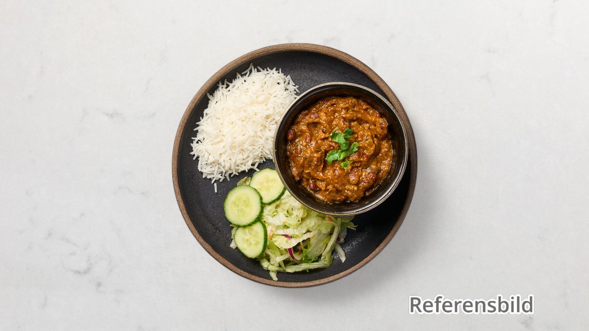 Kyckling med Indiska basmatiris, isbergssallad, curry, grådde och Indiska kryddor.