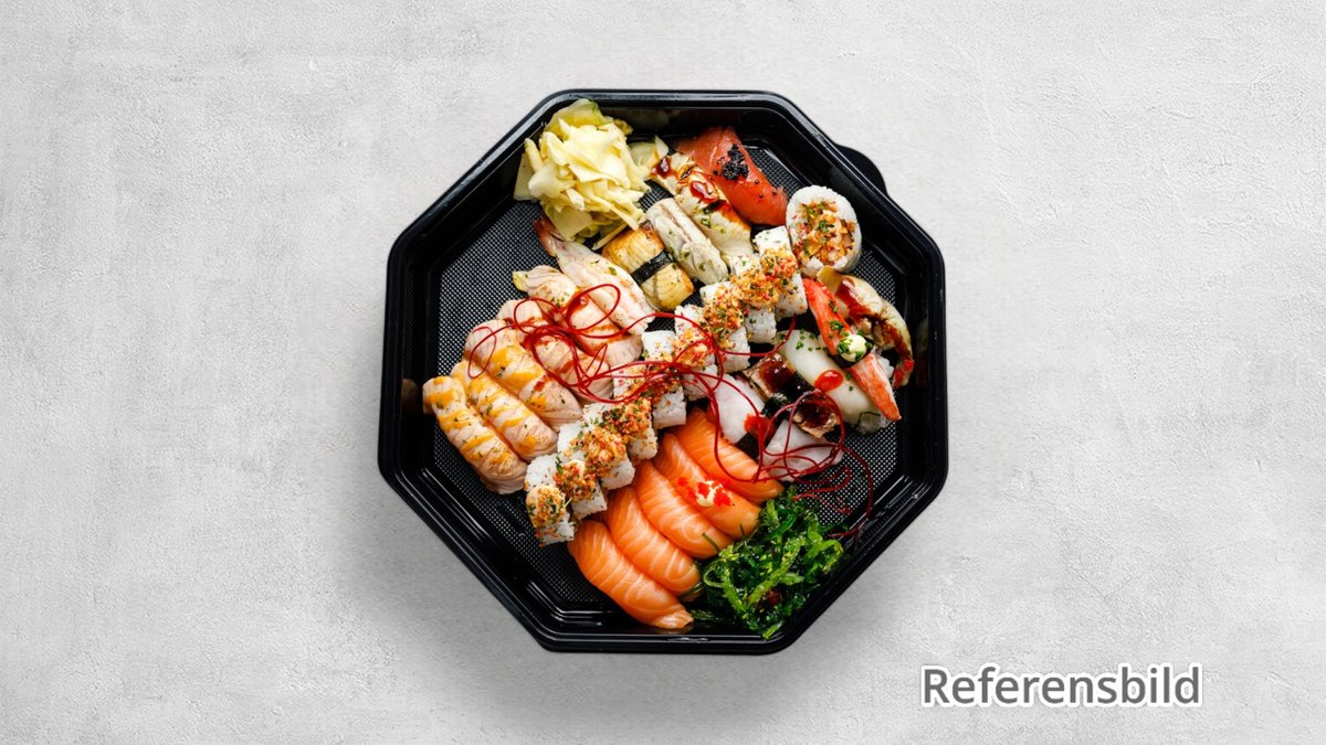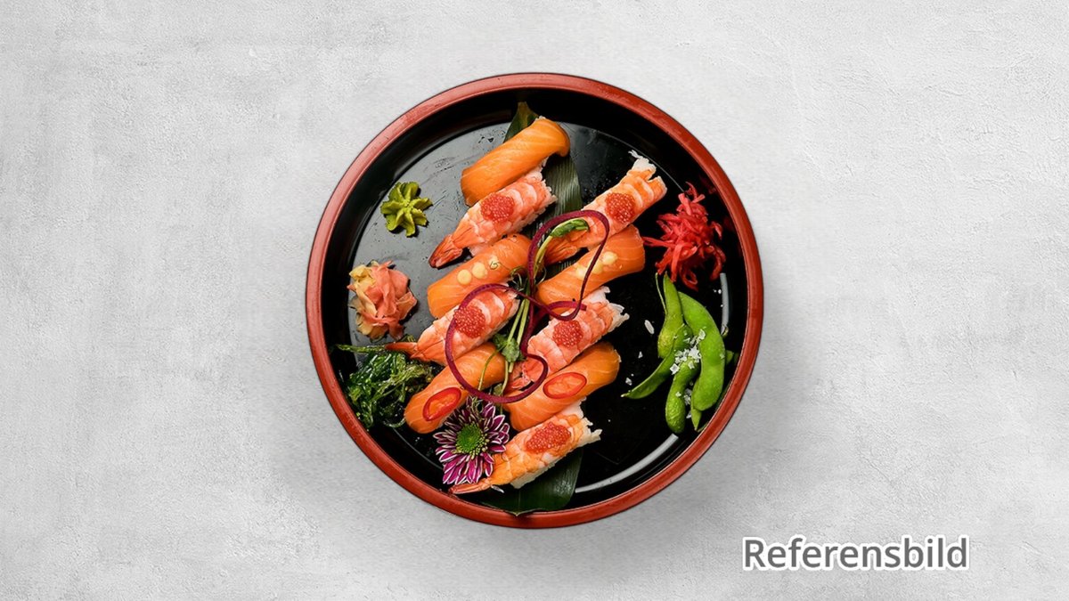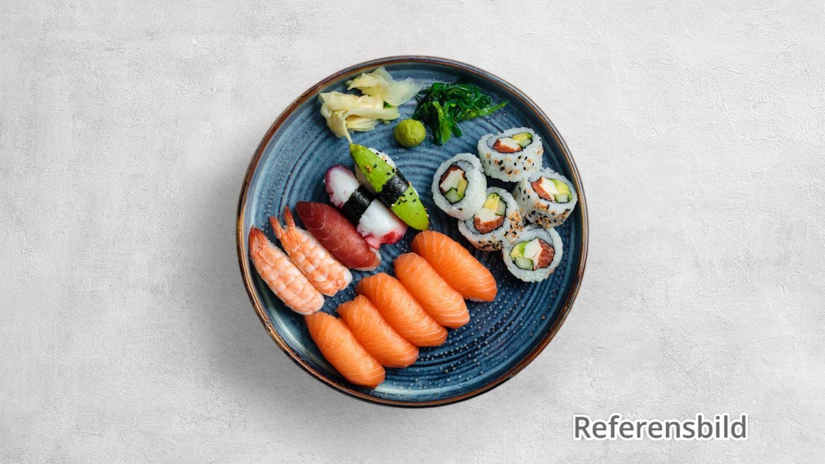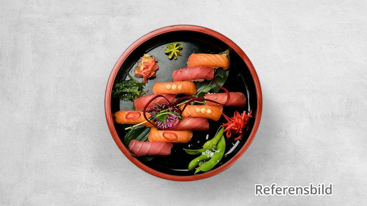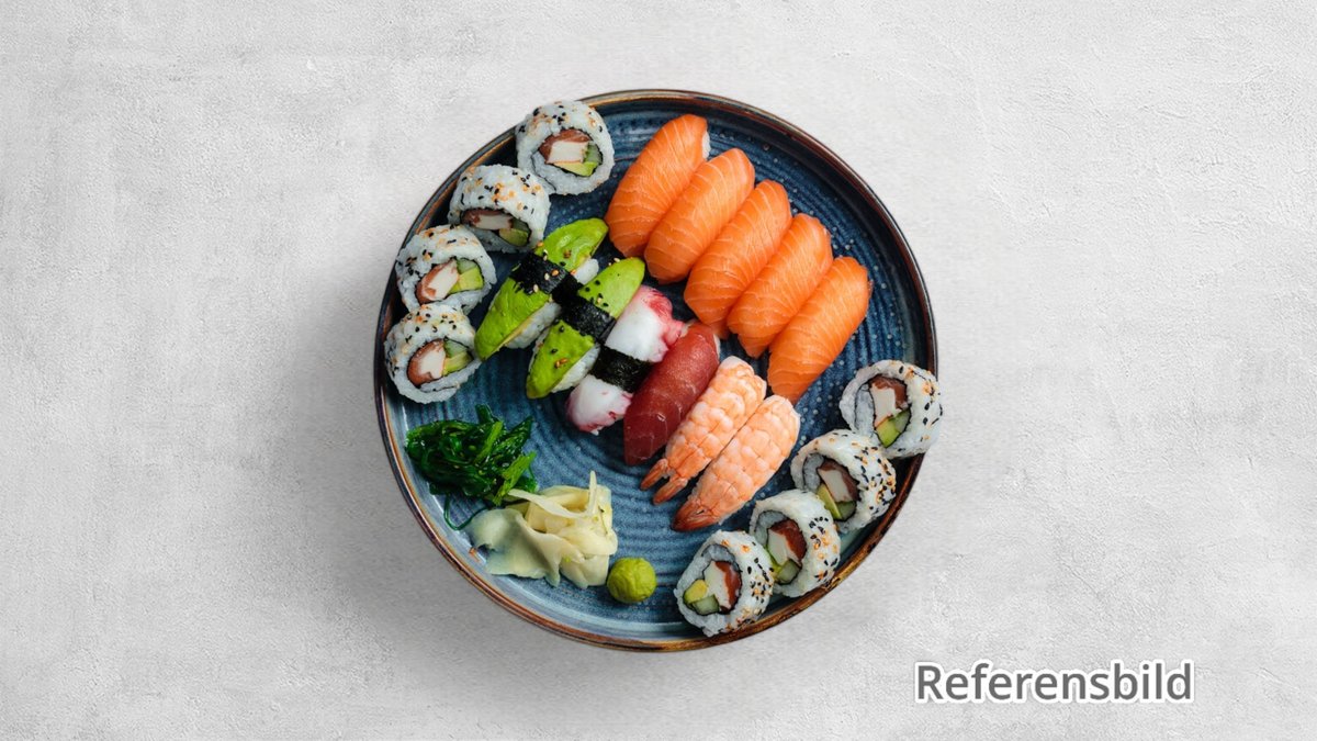 5 lax och 5 tonfisk. Toppings av olika slag kan förekomma