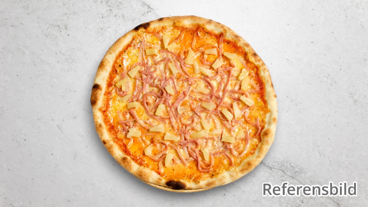 Tomatsås, ost, skinka, paprika, lök och ananas.