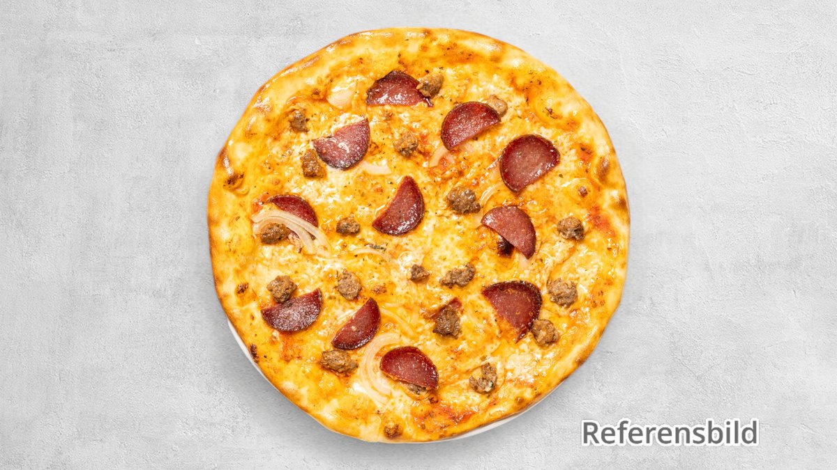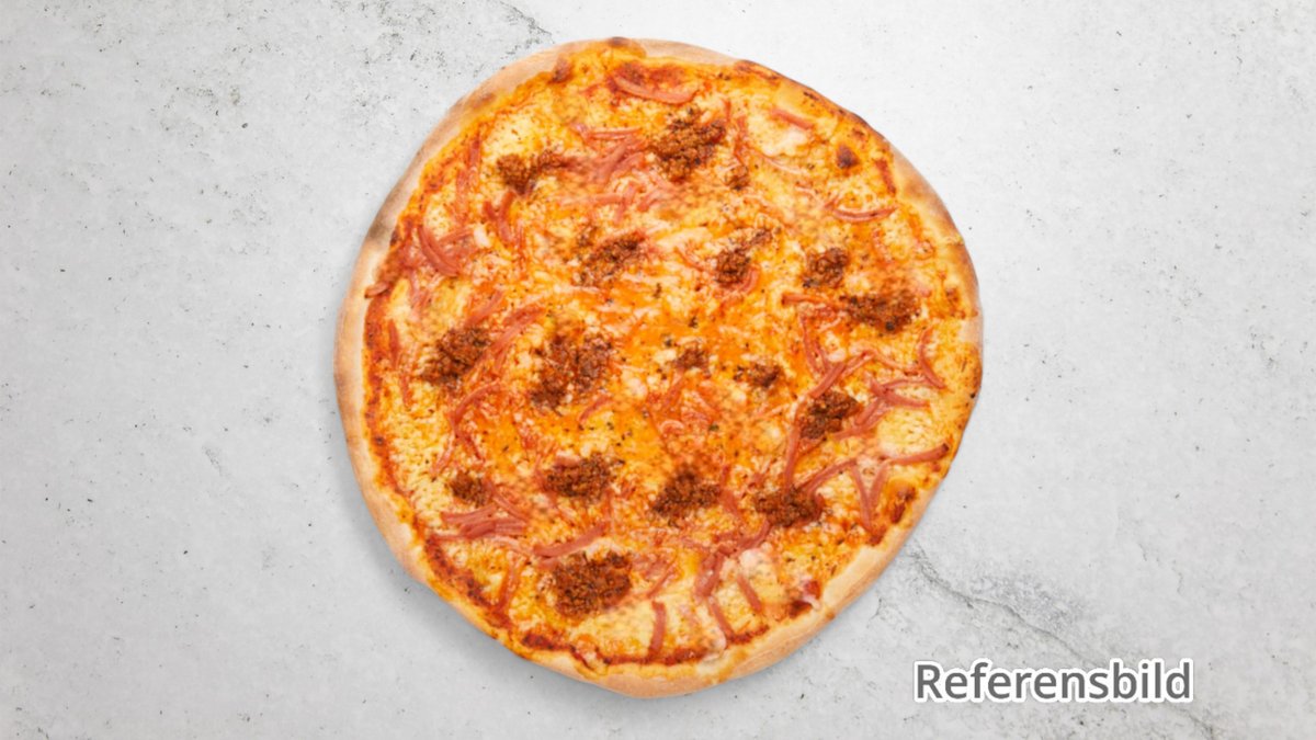 Tomatsås, ost, salami, tomater, lök och högrevsfärs.
