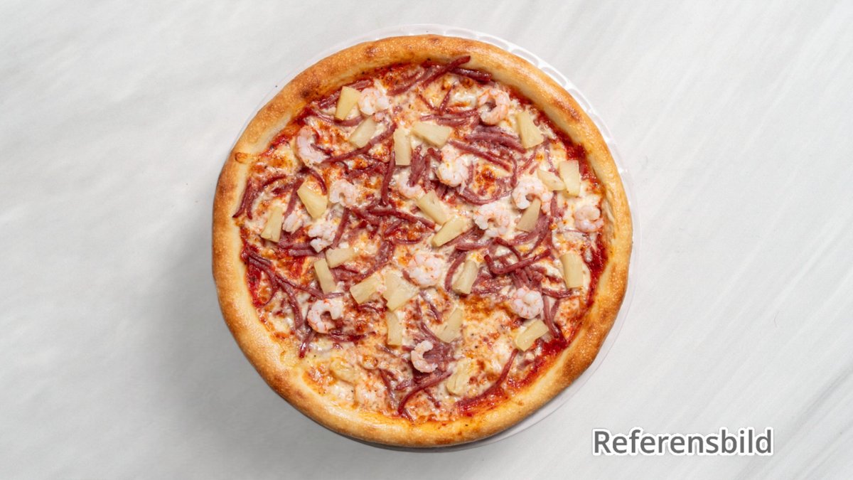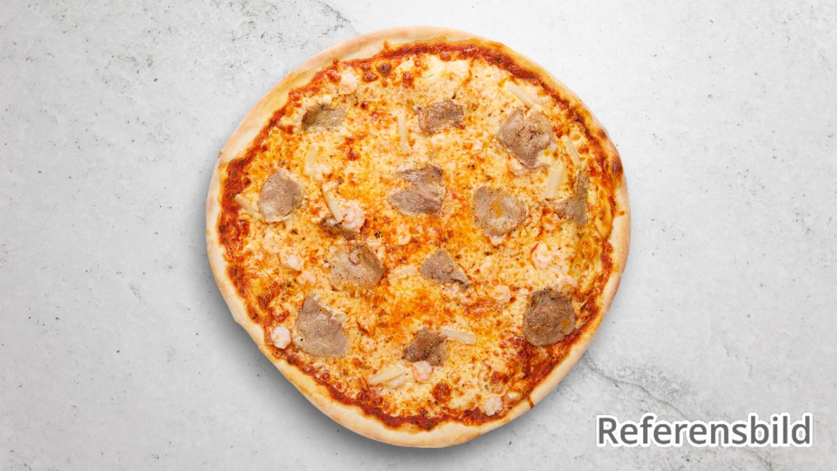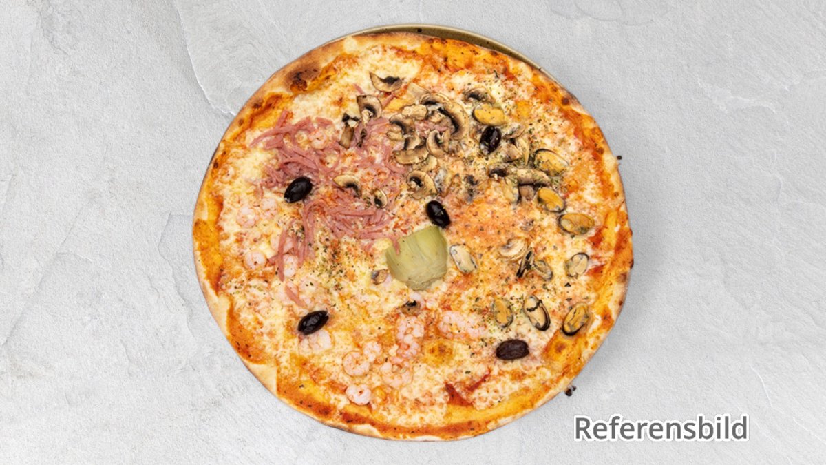 Tomatsås, ost, skinka, räkor, kronärtskocka, oliver och musslor.