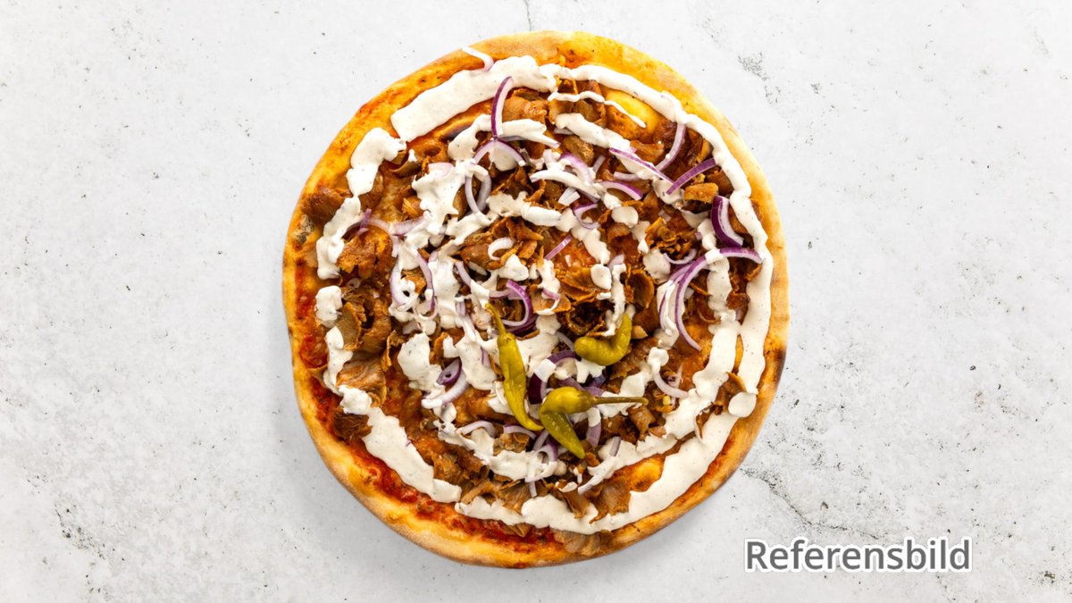 Tomatsås, ost, lök, ananas, feferoni och valfri kebabsås.