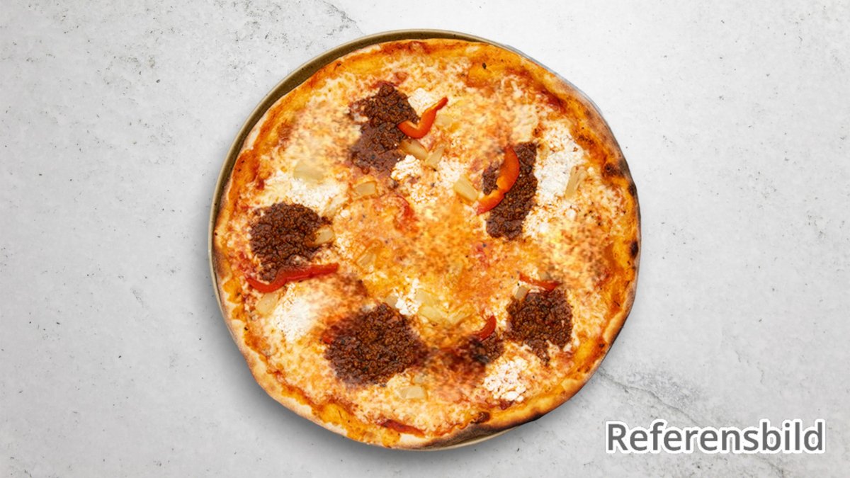 Tomatsås, ost, oliver, tomat, lök, ananas och panerad högrevsfärs.