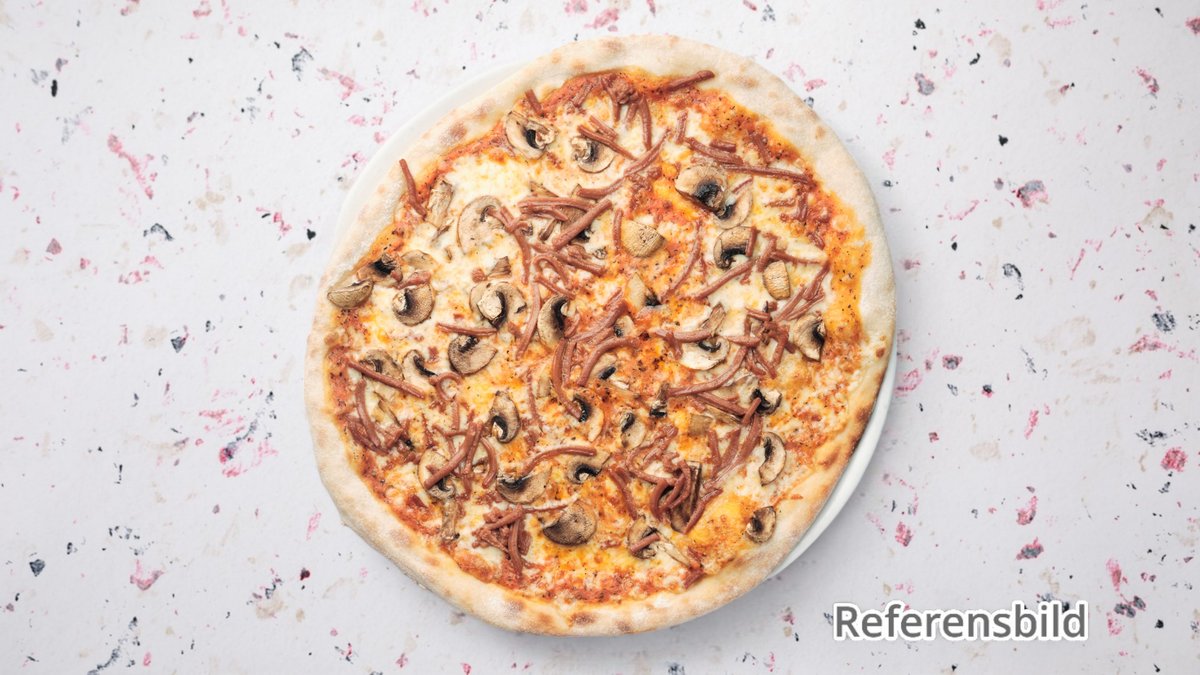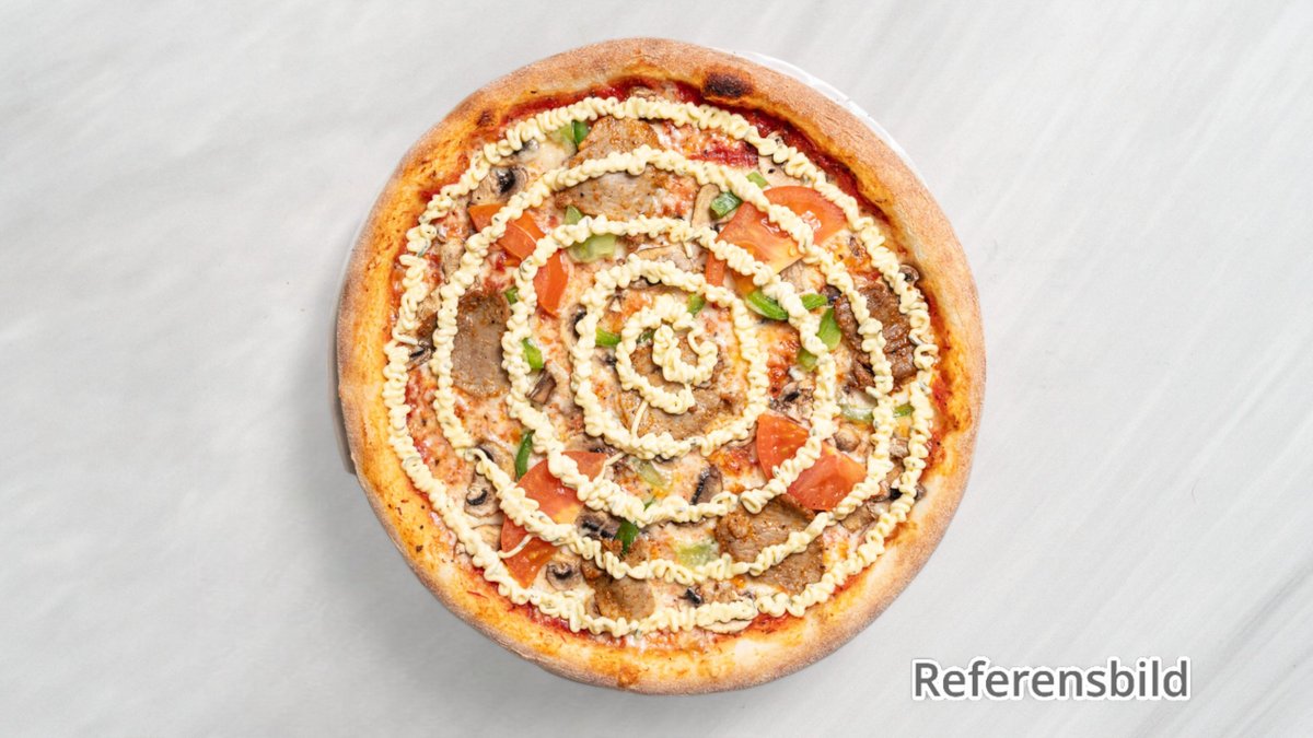 Tomatsås, ost, lök, färska champinjoner, ruccola och valfri kebabsås.