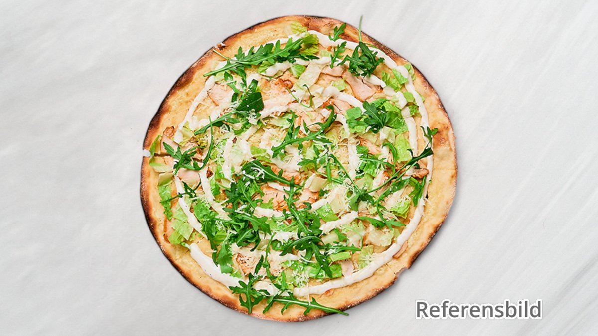 Tomatsås, ost, kyckling, cocktailtomater och caesardressing.