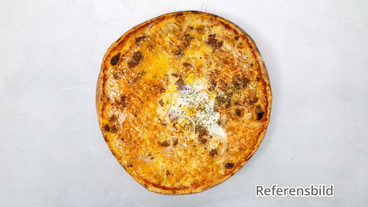 Tomatsås, ost, skinka, ägg, lök, tomater och högrevsfärs.