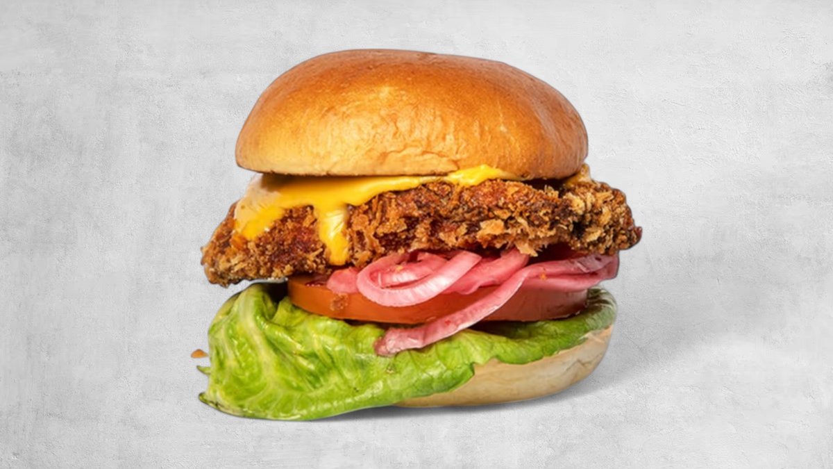 Hamburgerbröd, kycklingfilé, sallad, tomat, ost och majonnäs.