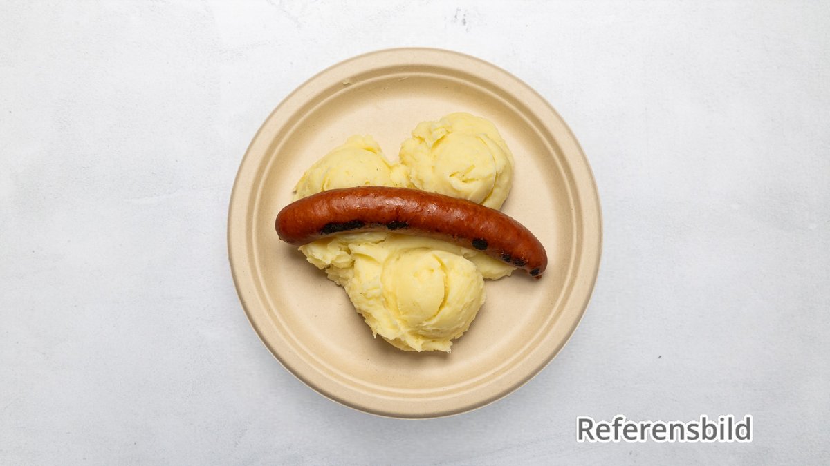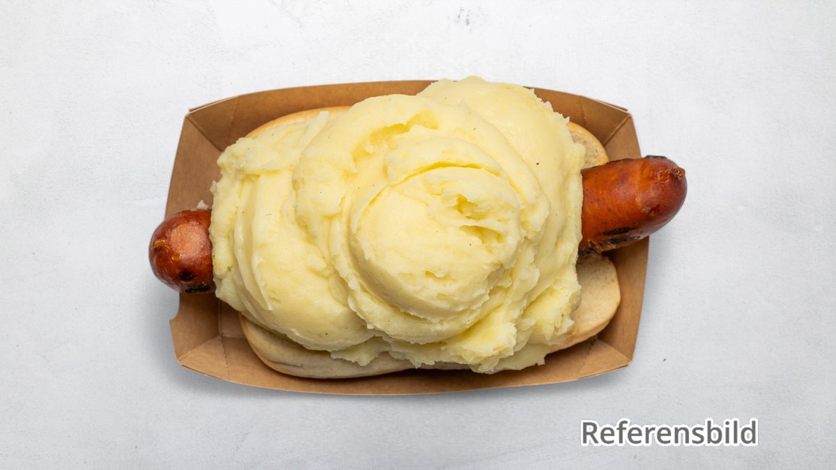 Tunnbrödsrulle med kokt eller grillad korv, hemlagat mos, räksallad, sallad, tomat och rödlök. Välj variant i nästa steg.