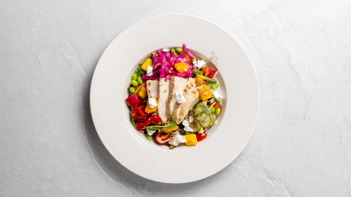 Alla sallader serveras med mixsallad, kål, sojabönor, tomat, rädisor, ärtskott, picklad rödlök, rostade frön och kaffebarens dressing.