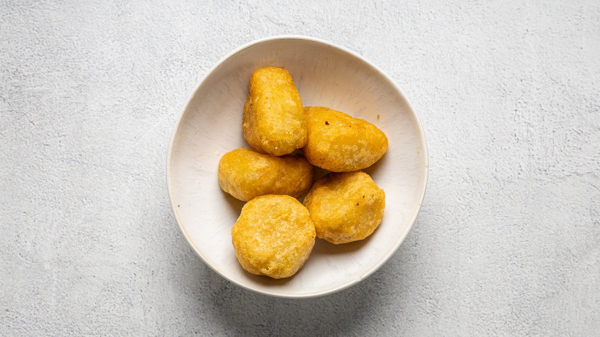 Chicken nuggets som serveras med pommes.