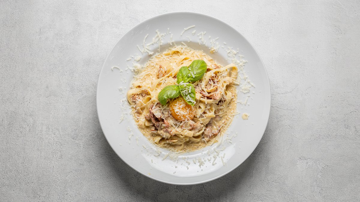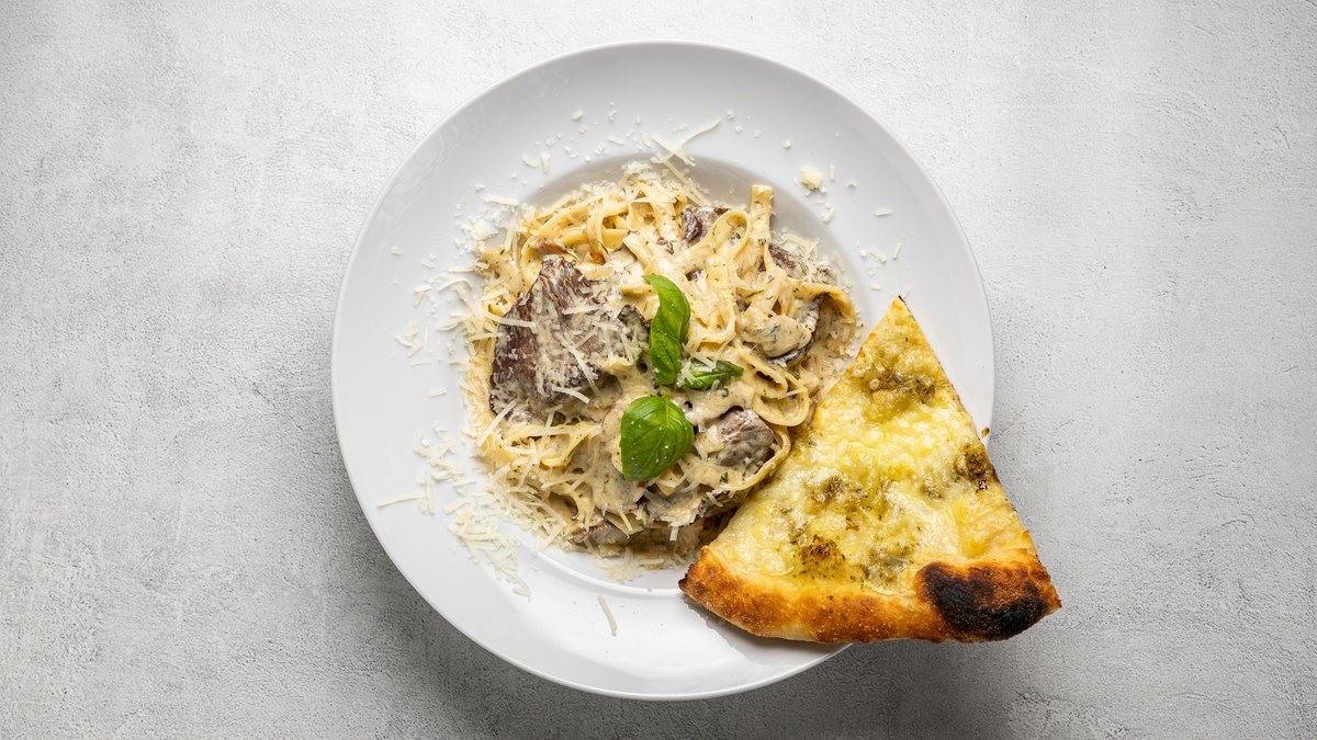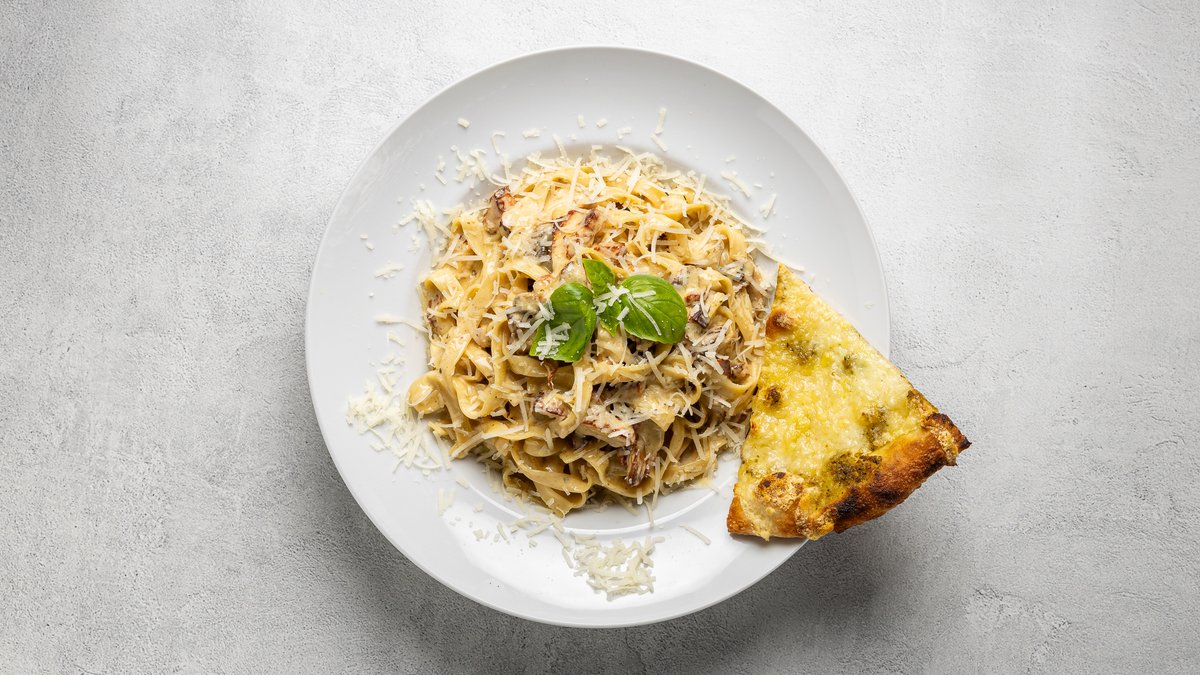 Pasta, kyckling, svamp, fetaost, parmesan och krämig currysås.