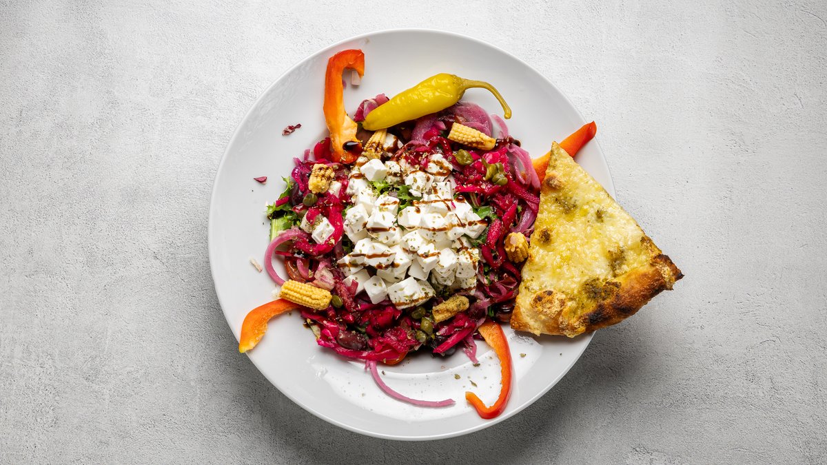 Alla sallader serveras med mixad sallad, körsbärstomater, picklad rödlök, rödkål, gurka, parmesan, babymajs, kapris, balsamico, en dressing och vårt nybakade bröd.