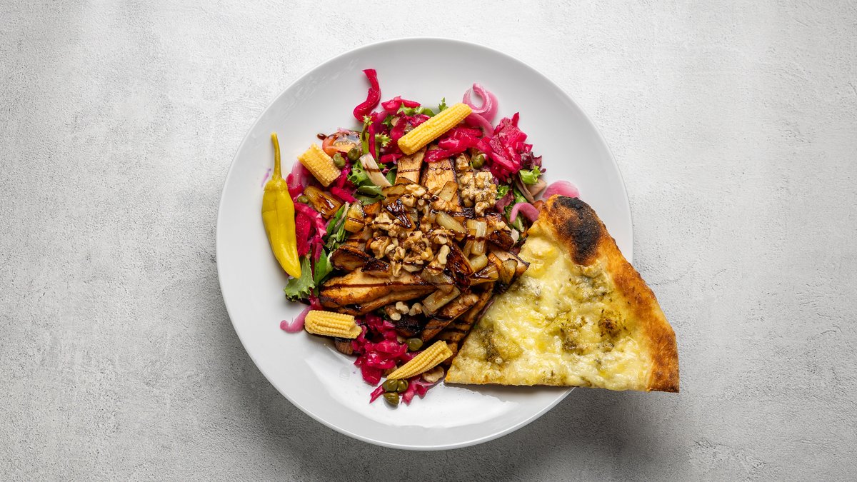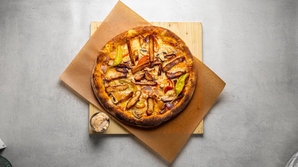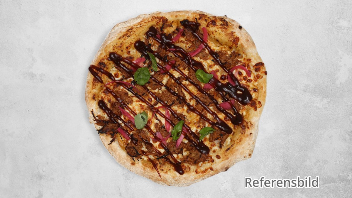 Tomatsås, mozzarella, salami, jalapeño, pulled pork, körsbärstomater, picklad lök och bearnaisesås.