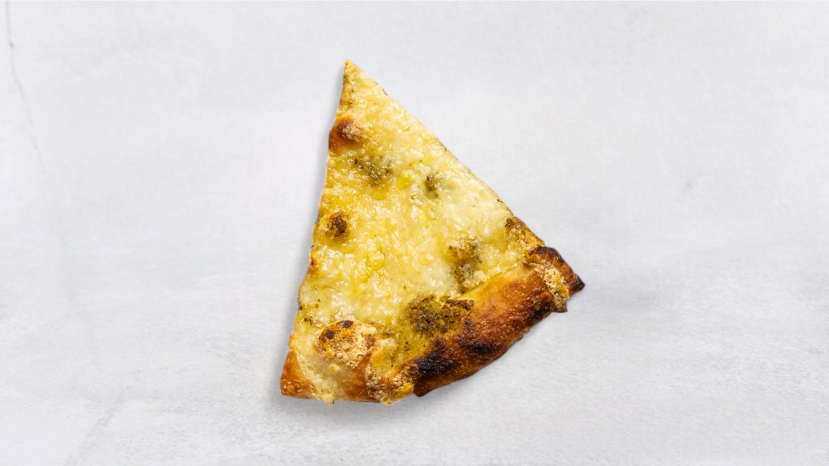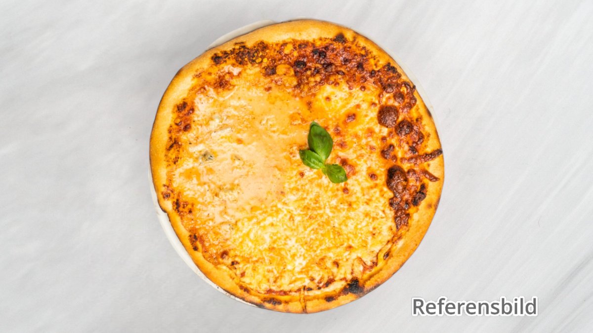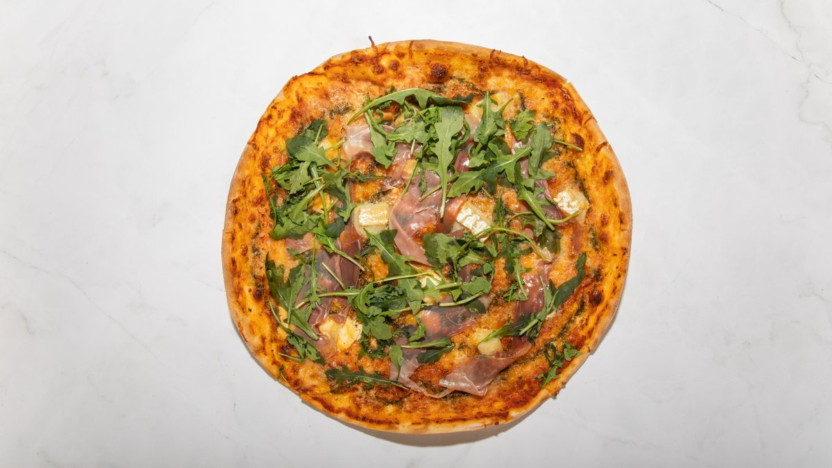 Tomatsås, gorgonzola, mozzarella, pesto, fetaost, parmesan och ruccola.