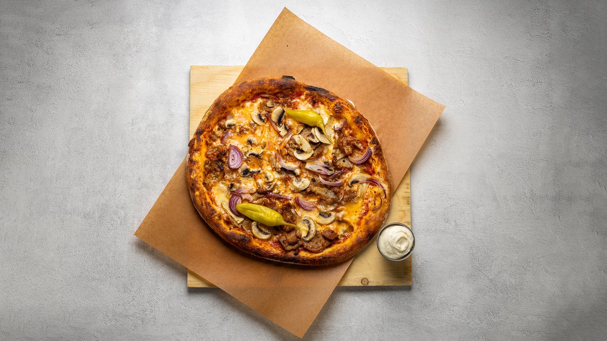 Tomatsås, mozzarella, magnifico salami, spansk peppar, knaprig bacon och rödlök.