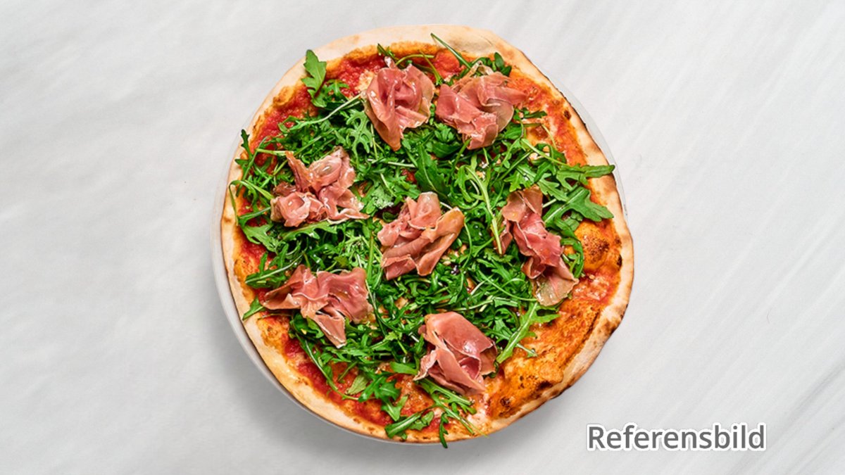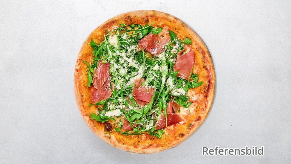 Tomatsås, mozzarella, lufttorkad skinka, körsbärstomater, parmesan och ruccola.