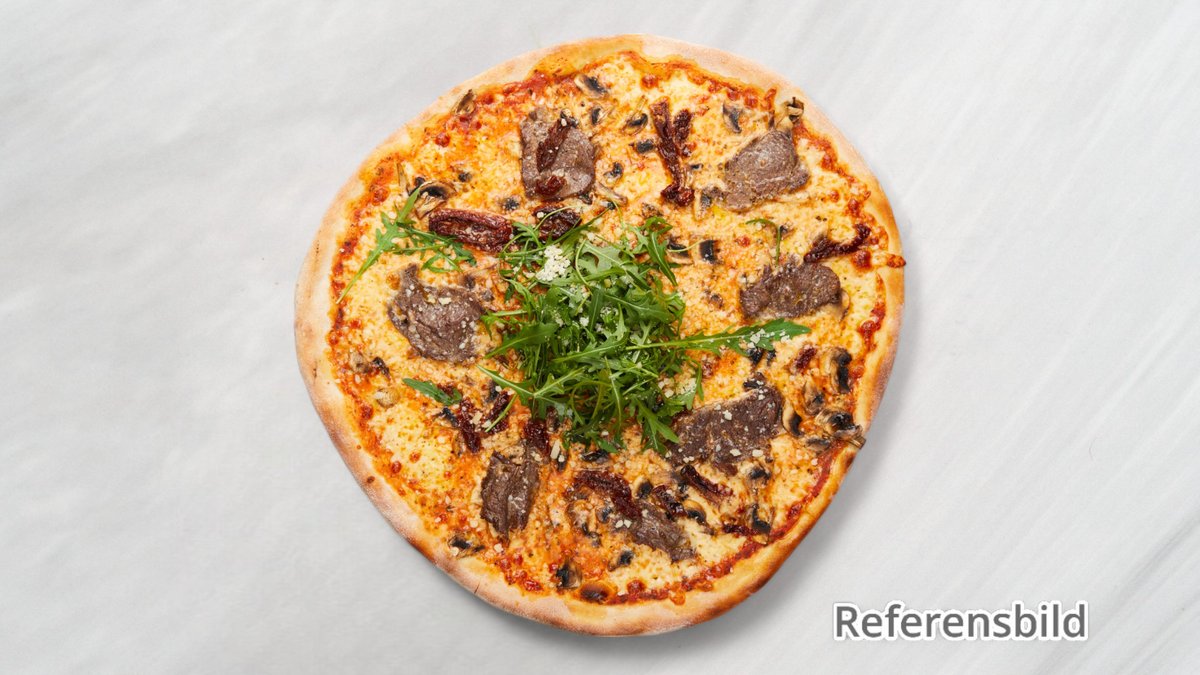 Tomatsås, mozzarella, svamp, oxfilé, gorgonzola, körsbärstomater och bearnaisesås.