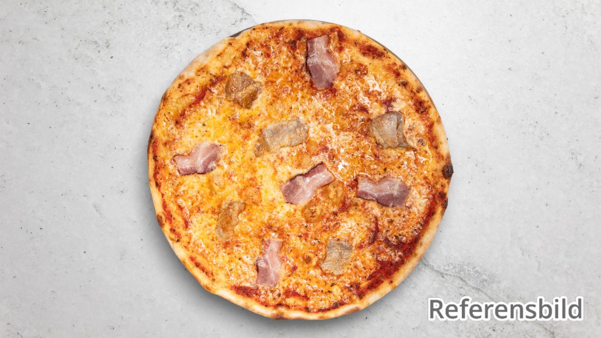 Tomatsås, mozzarella, kokt skinka, ungersk salami, bacon och rödlök.