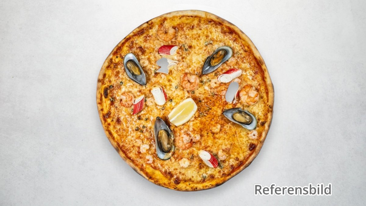 Tomatsås, mozzarella, blåmusslor, scampi, picklad rödlök, citron, basilika och vitlök.