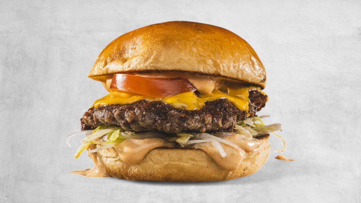 Burgare med ost, lök, sallad, tomat och dressing. Pommes, dipp och en valfri 33 cl dryck ingår.