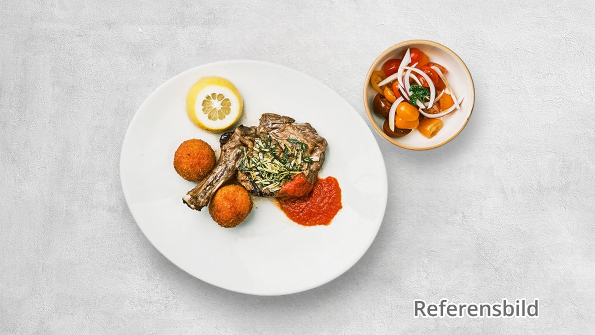 Läckra grillade lammracks med mustig rödvinssås, potatisgratäng toppad med parmesan och capponata.