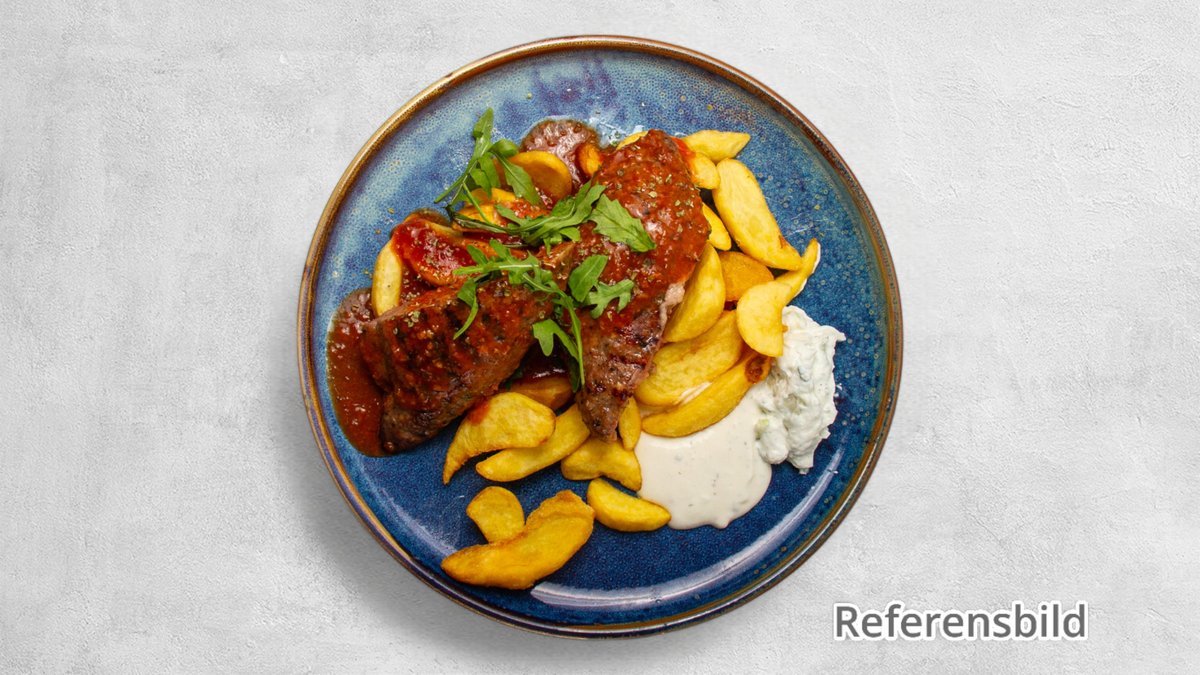 Grillad ryggbiff, toppad med parmesanost, ringlad olivolja, hemlagad bearnaise och pepparsås. Serveras med grillade grönsaker och potatisgratäng
