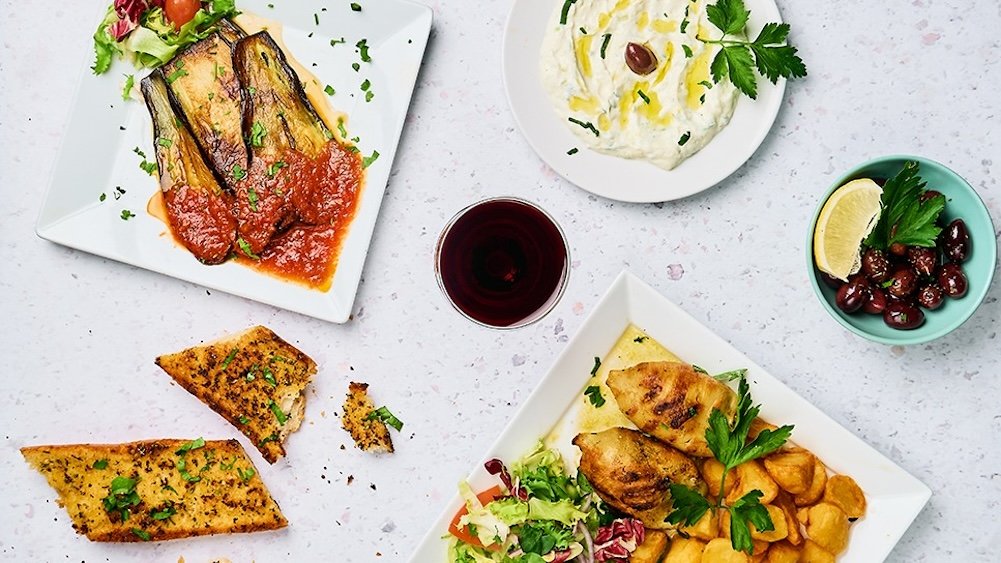 Fetaostgratinerade grönsaksfyllda auberginer, tzatziki, grillad halloumi, kryddig tomatsås, oliver och friterad klyftpotatis.