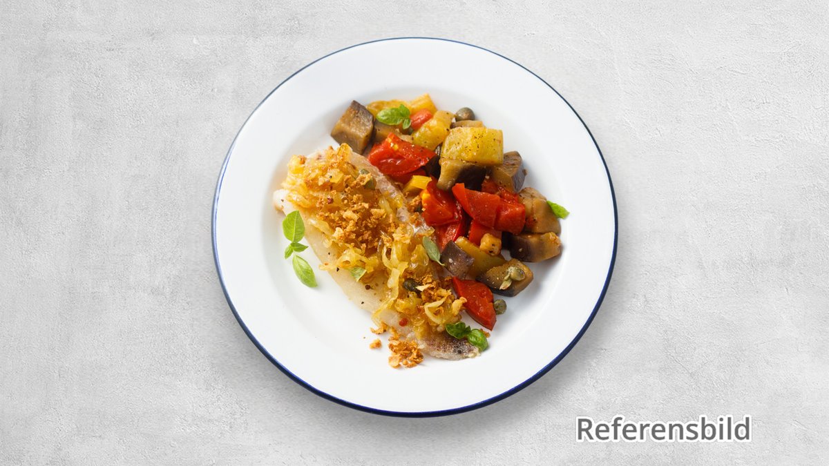 Smör- och örtbakad hälleflundra vilande på caponata siciliana, toppad med pepparrot eller vitvinssås. Serveras med svampfyllda pastakuddar.