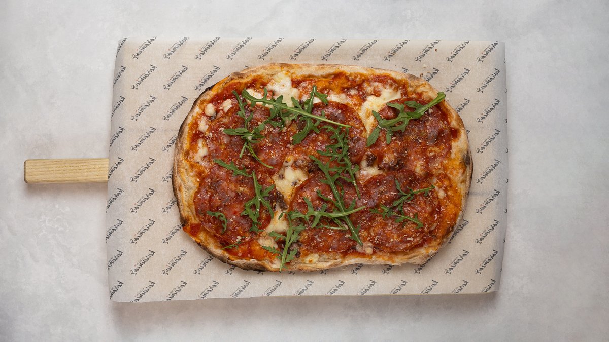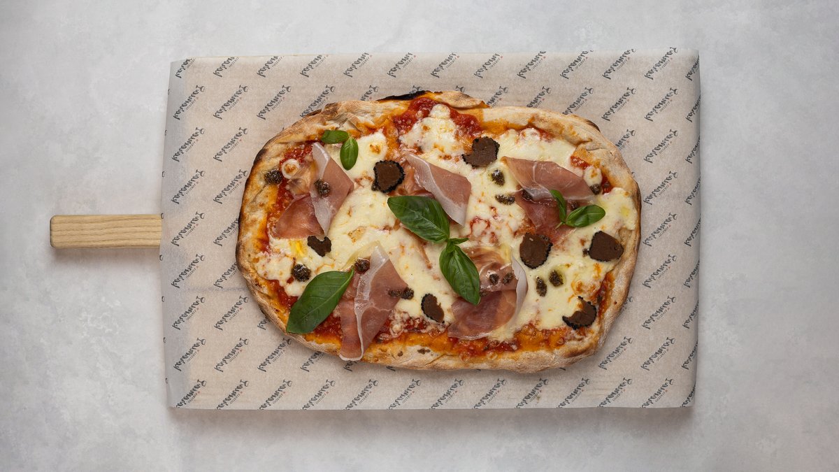 Tomatsås och mozzarella. Toppad med parmaskinka, Parmigiano Reggiano och en klick tryffelkräm. Avslutas med färsk basilika och kallpressad olivolja.