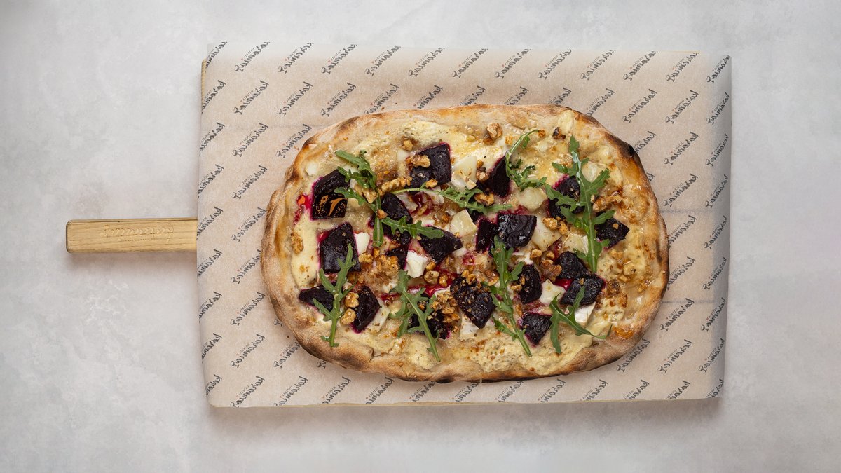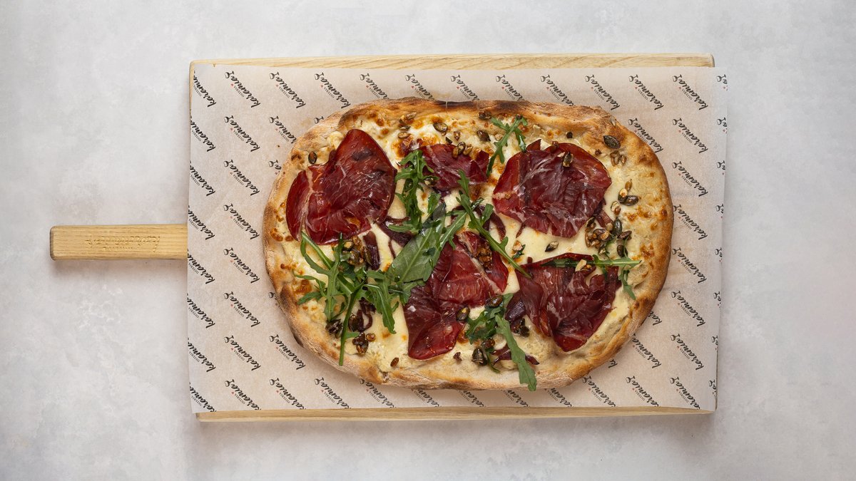 Mozzarella, parmesan, karamelliserad rödlök, fikon, black angus bresaola, ruccola, honungsrostade pumpa och solrosfrön.