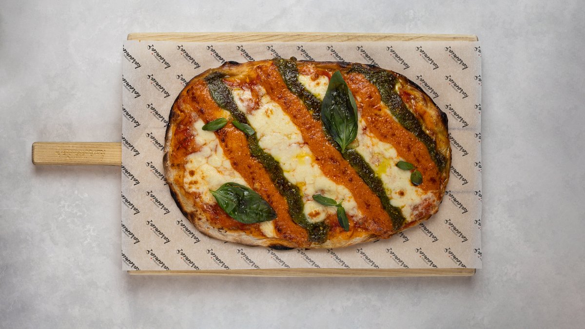 Tomatbotten med smält mozzarella, toppad med röd pesto, grön pesto och mozzarella. Strös med Parmigiano Reggiano.
