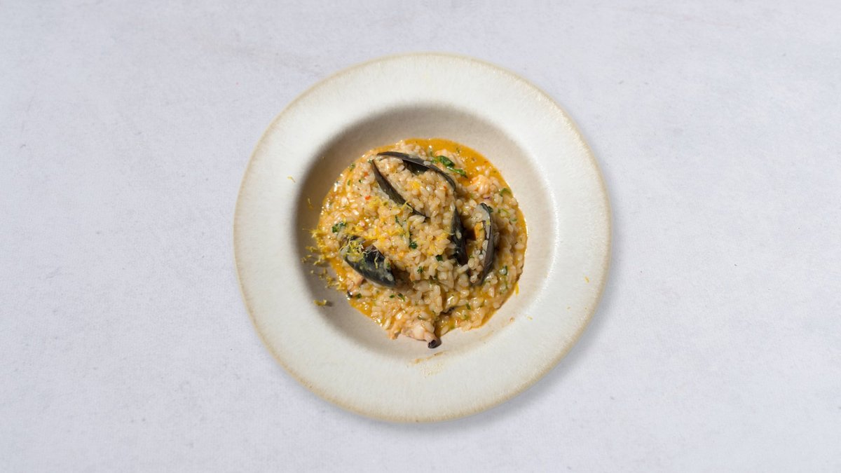 Risotto tillagad med vår egen 12-timmars hummerbuljong. Serverad med scampi, bläckfisk och musslor. Vitt vin, en skvätt citron och Parmigiano Reggiano.
