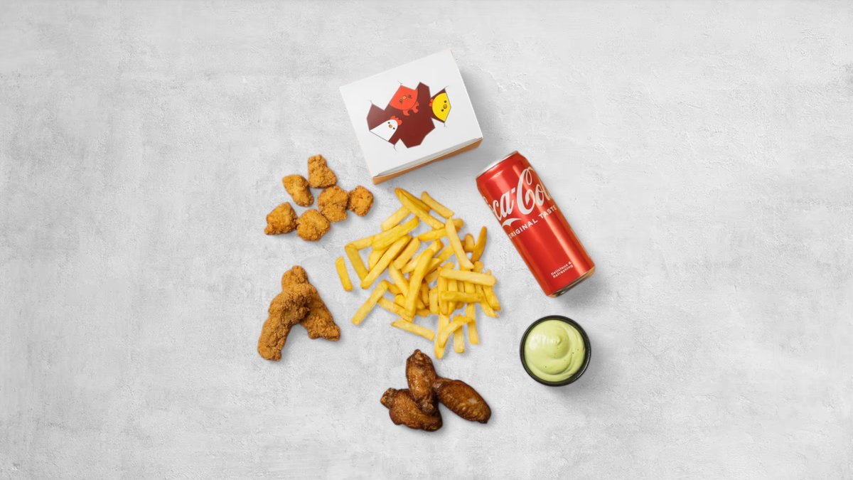 2 st Tender bites, 3 st wings, 6 st popcorn, en valfri sidez, en sås och en läsk.